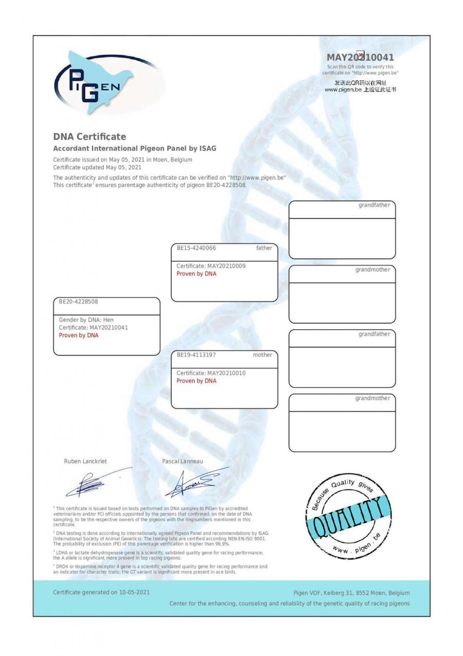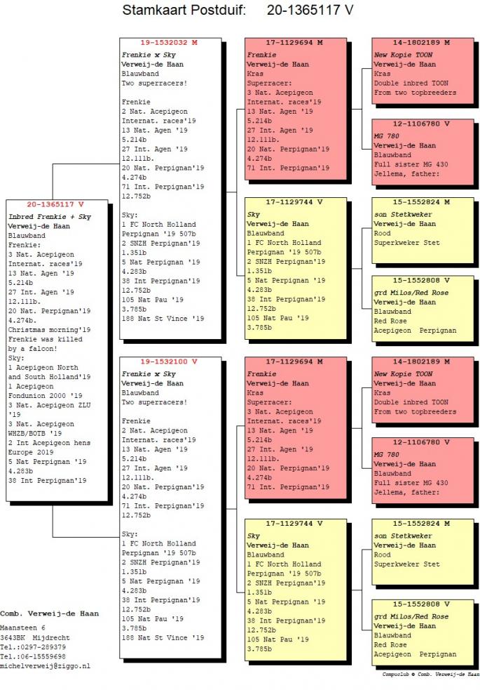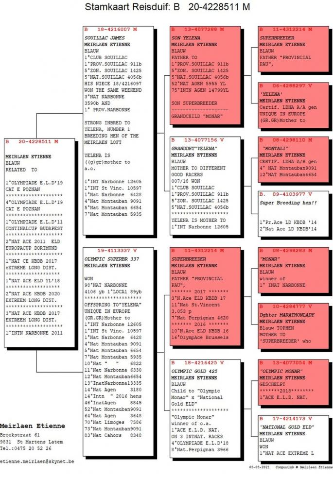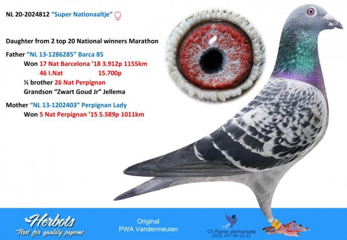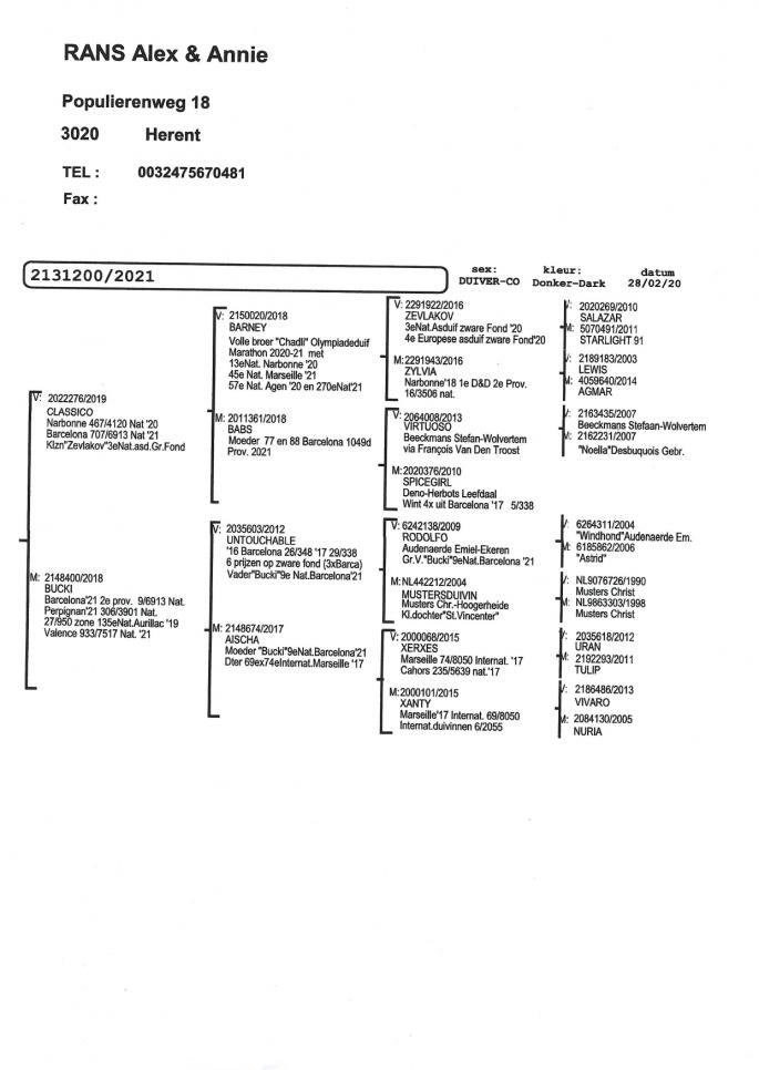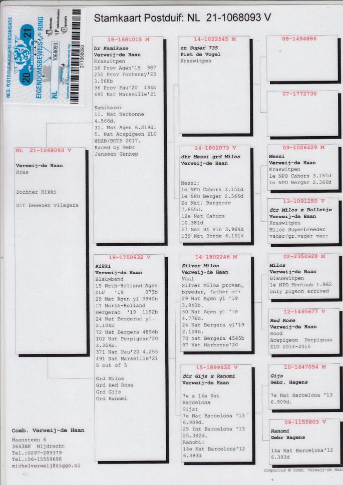 Fiica frate Kamikaze 56 Porv Agen 987 p. 2019 255 Prov Fontenay 3568 p. 2020 Kamikaze: 11 Nat Narbone 4566 p. 31 Nat Agen 6219 p. 5 Nat Ace Pigeon ZLU/WHZB 2017