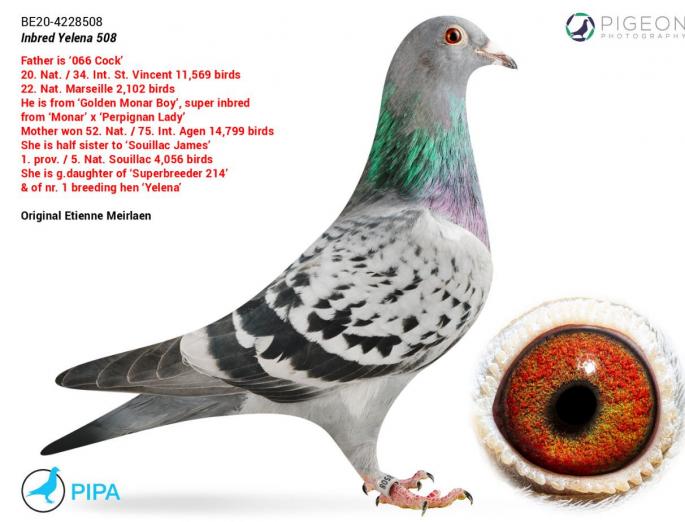 100% Meirlaen Etienne Fiu Souiliac James : 1 Prov. Souiliac 911b 5 Zon. Souiliac 1425b 3 Nat. Souiliac 4056b Nepot si stranepot SuperBreeder, tata la 3 Nat. As Maraton 2017 16 Int. Olimpiada Bruxelles etc. Stranepot Monar 1 Int. Narbonne 2 Europa Cup Maraton Strranepot Olympic Monar 1 Nat. As Maraton Belgia 2018 Stranepoat Yelena, reproducatoare spectaculoasa pentru Meirlaen Etienne