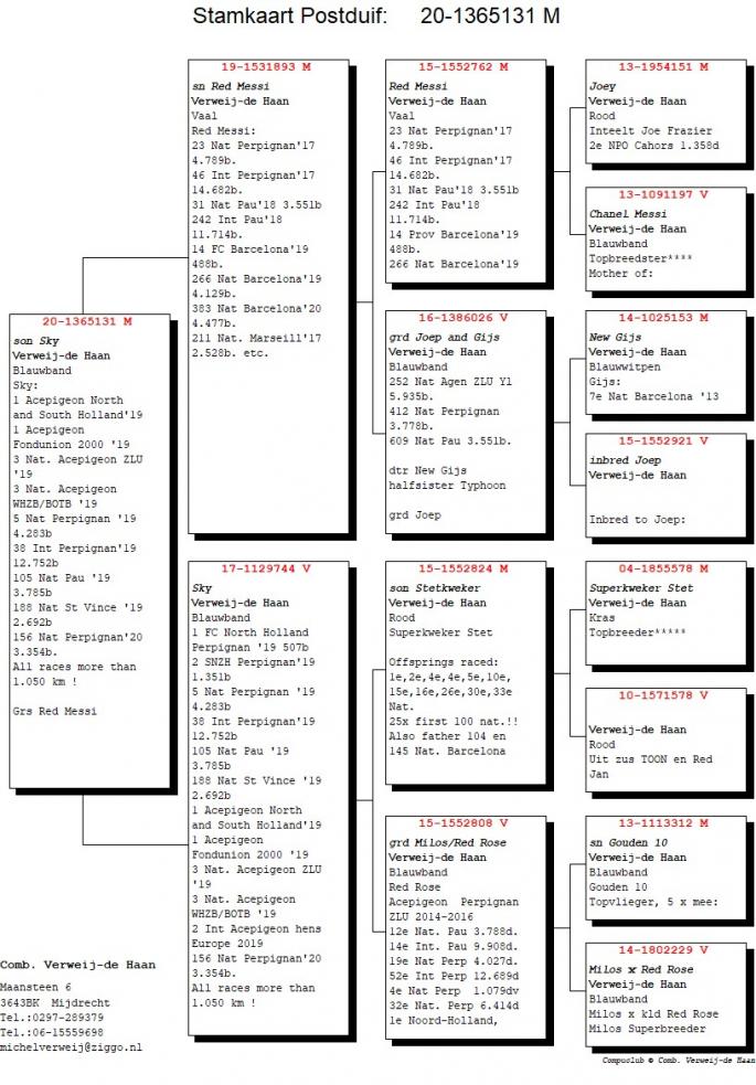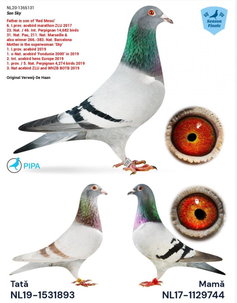 Fiu Sky 1 Acepigeon North South Holland 19 1 Acepigeon Fondunion 2000 19 3 Nat. Acepigeon ZLU 19 2 Nat. Acepigeon WHZB/BOTB 19 188 Nat St Vince 19 12.692b 156 Nat Perpignan 20 2.354b Toate cursele peste 1.050 km! Nepot Red Messi 23 Nat. Perpignan 17 31 Nat. Pau 18 52 Int Perpig 12689p 32 Nat Perpig 6414p
