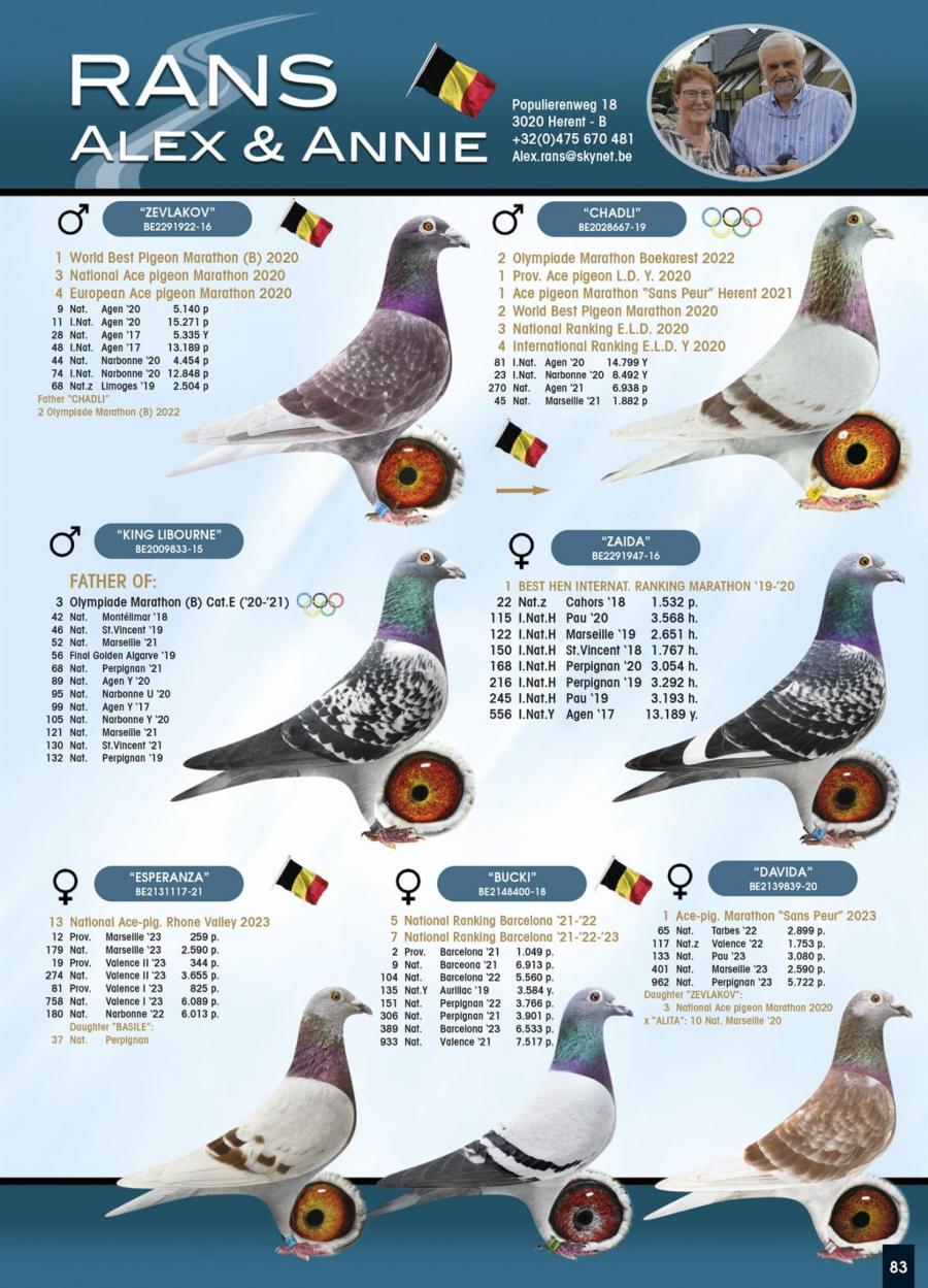 100% Rans Alex & Annie Fiu Bucki 9 Nat. Barcelona 6913 p. 21 104 Nat Barcelona 6560 p. 22 389 Nat Barcelona 6533p 23 5 Nat Barcelona 21-22 7 Nat Barcelona 21-22-23 Stranepot Zevlakov 1 World Best Pigeon Maraton 20 3 Nat. As Maraton 2020 4 Europa As Maraton 2020 oferta curenta: - |