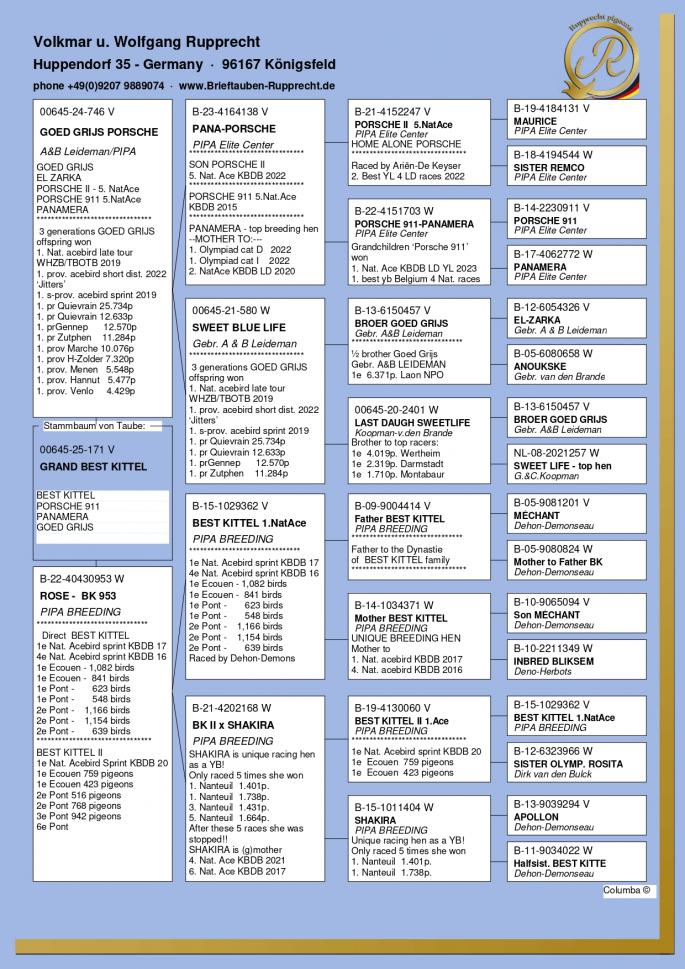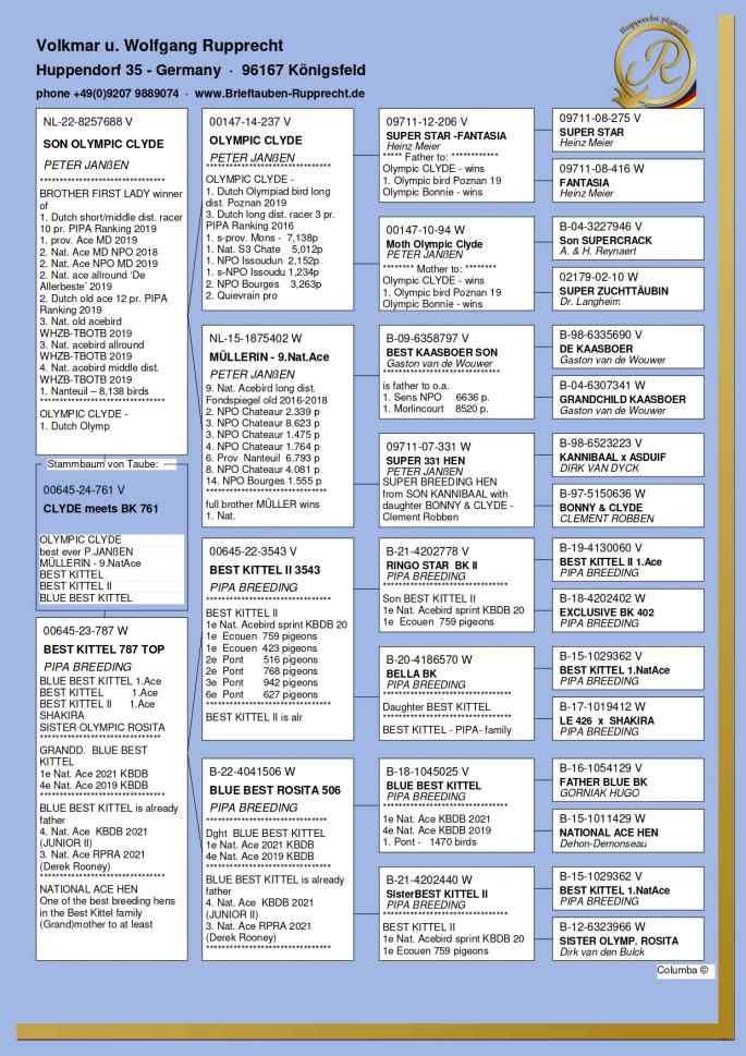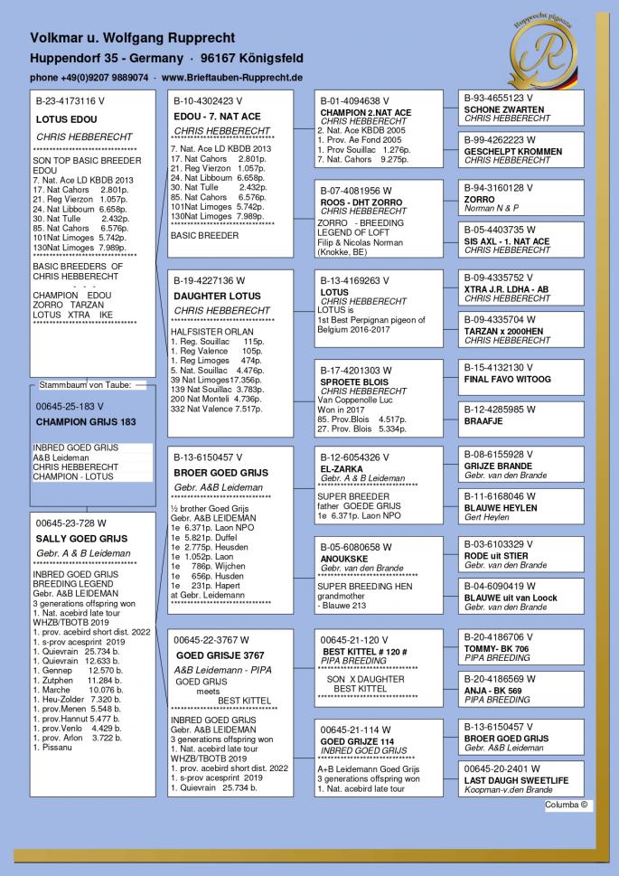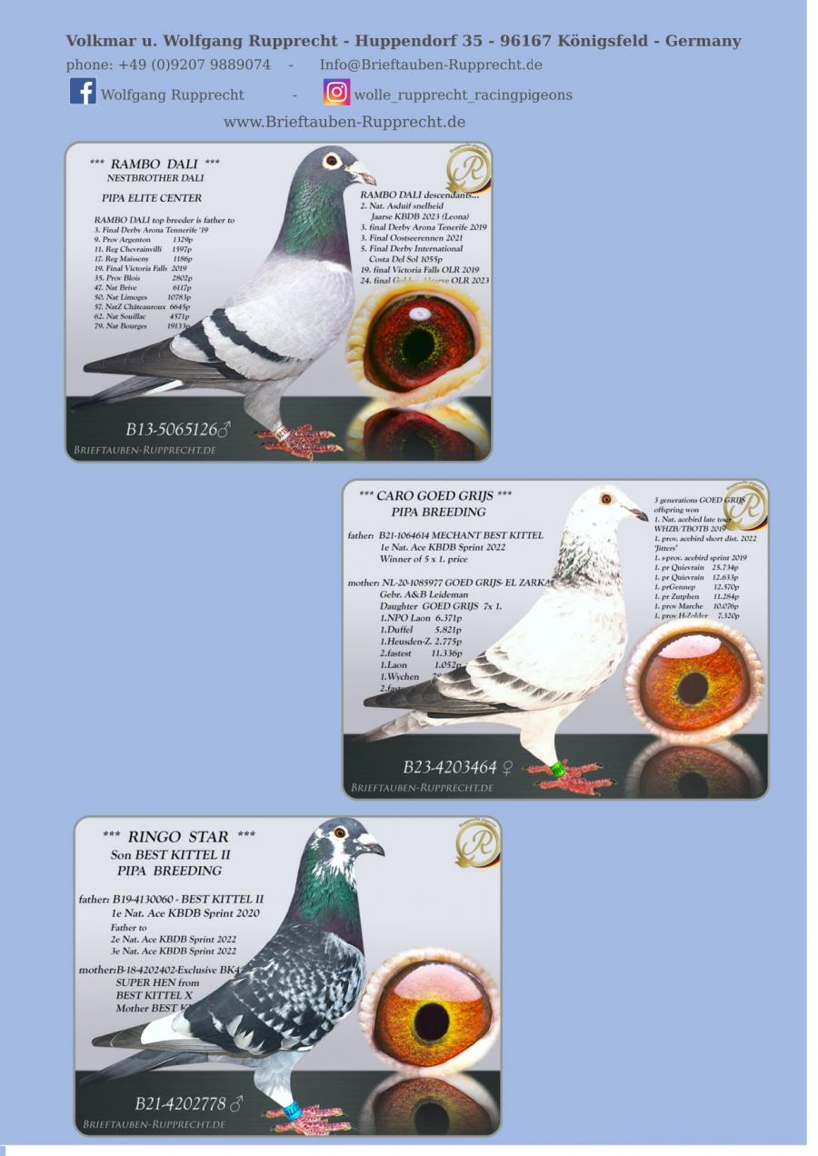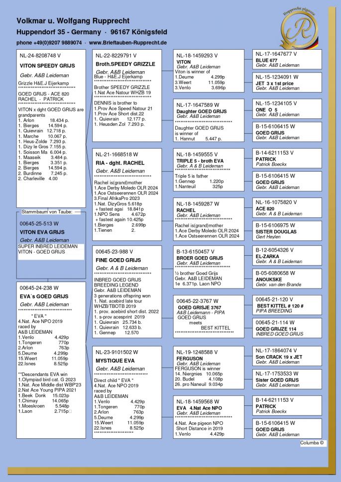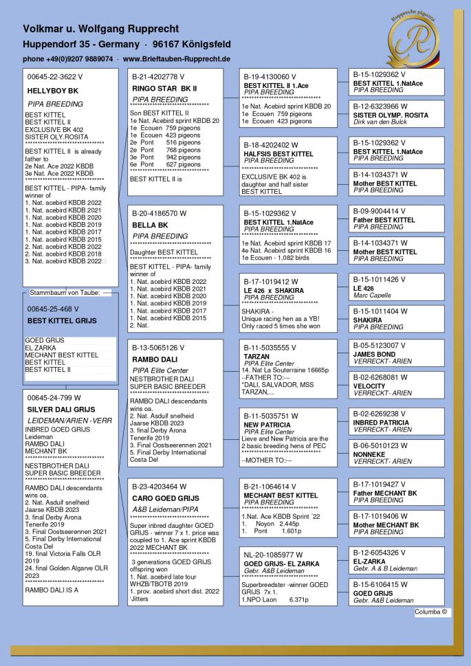 Stranepot Best Kittel 1 Nat. As Viteza Belgia 2017 6 Nat. As Viteza Belgia 2016 Stranepot Best Kittel II 1 Nat. As Viteza KBDB 20 Nepot RAMBO DALI super reproducator, tata la 3. Final Derby Arona Tennerife "19 9. Prov Argenton 1329p 11. Reg Chevrainvilli 1597p 17. Reg Maisseny 1186p 19. Final Victoria Falls 2019 35. Prov Blois 2802p 47. Nat Brive 6117p 50. Nat Limoges 10783p 57. NatZ Chateauroux 6645p 62. Nat Souillac 4571p 79. Nat Bourges 19133p 4e Nat. Ace KBDB 2019 Bunica din partea mamei este consangvina pe Goede Grijs 1. NPO Laon 6,371 p 1. Duffel 5,821 b. 1. Heusden Zolder 2,775 p 1. Laon 1,052 p 1. Wijchen 786 p 1. Heusden-Zolder 656 p 1. Hapert 231 p oferta curenta: TheTopflyers |
