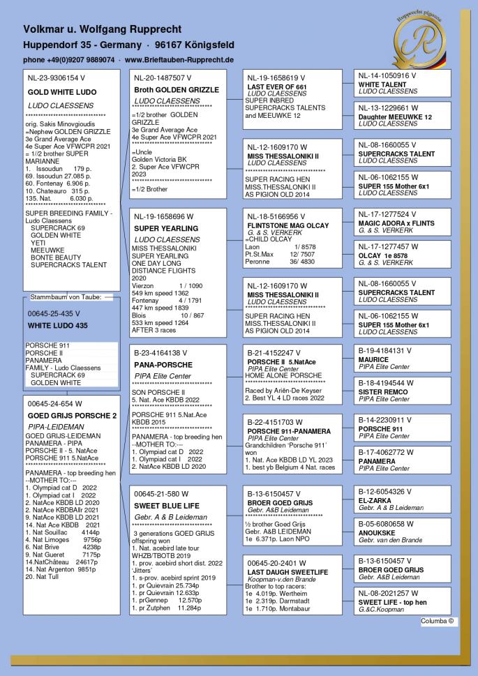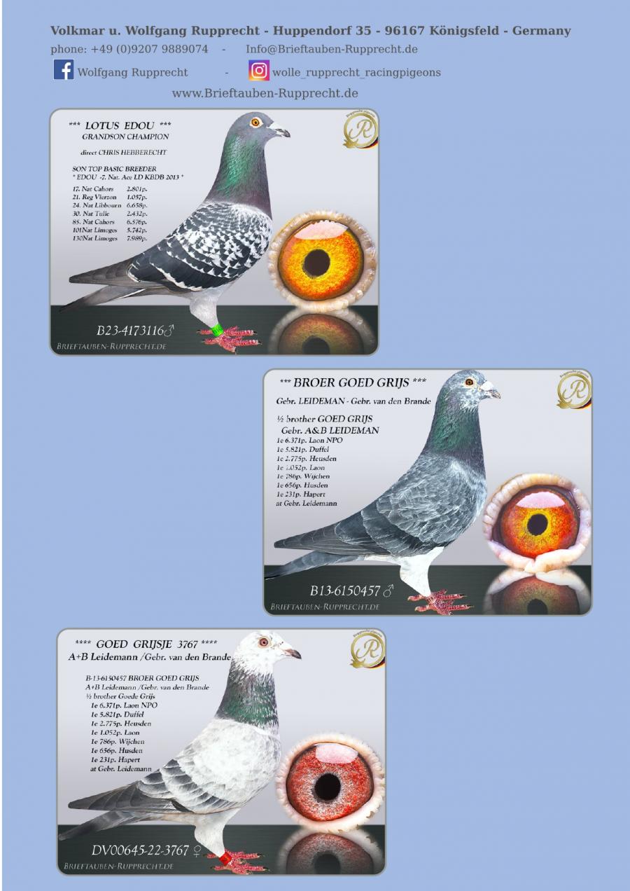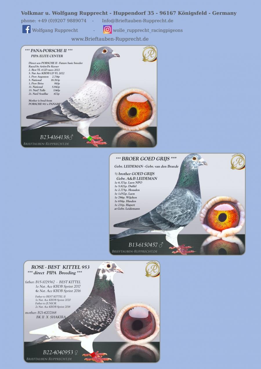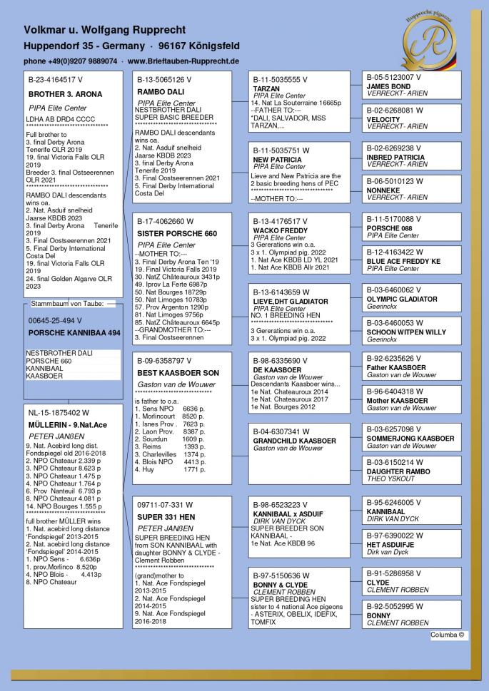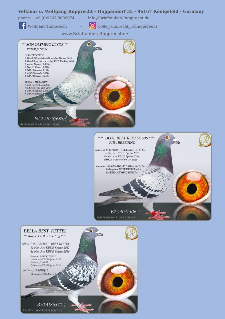 Stranepot Best Kittel 1 Nat. As Viteza Belgia 2017 6 Nat. As Viteza Belgia 2016 Stranepot Best Kittel II 1 Nat. As Viteza KBDB 20 Nepot RAMBO DALI super reproducator, tata la 3. Final Derby Arona Tennerife "19 9. Prov Argenton 1329p 11. Reg Chevrainvilli 1597p 17. Reg Maisseny 1186p 19. Final Victoria Falls 2019 35. Prov Blois 2802p 47. Nat Brive 6117p 50. Nat Limoges 10783p 57. NatZ Chateauroux 6645p 62. Nat Souillac 4571p 79. Nat Bourges 19133p 4e Nat. Ace KBDB 2019 Bunica din partea mamei este consangvina pe Goede Grijs 1. NPO Laon 6,371 p 1. Duffel 5,821 b. 1. Heusden Zolder 2,775 p 1. Laon 1,052 p 1. Wijchen 786 p 1. Heusden-Zolder 656 p 1. Hapert 231 p oferta curenta: TheTopflyers |