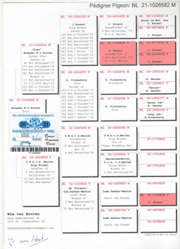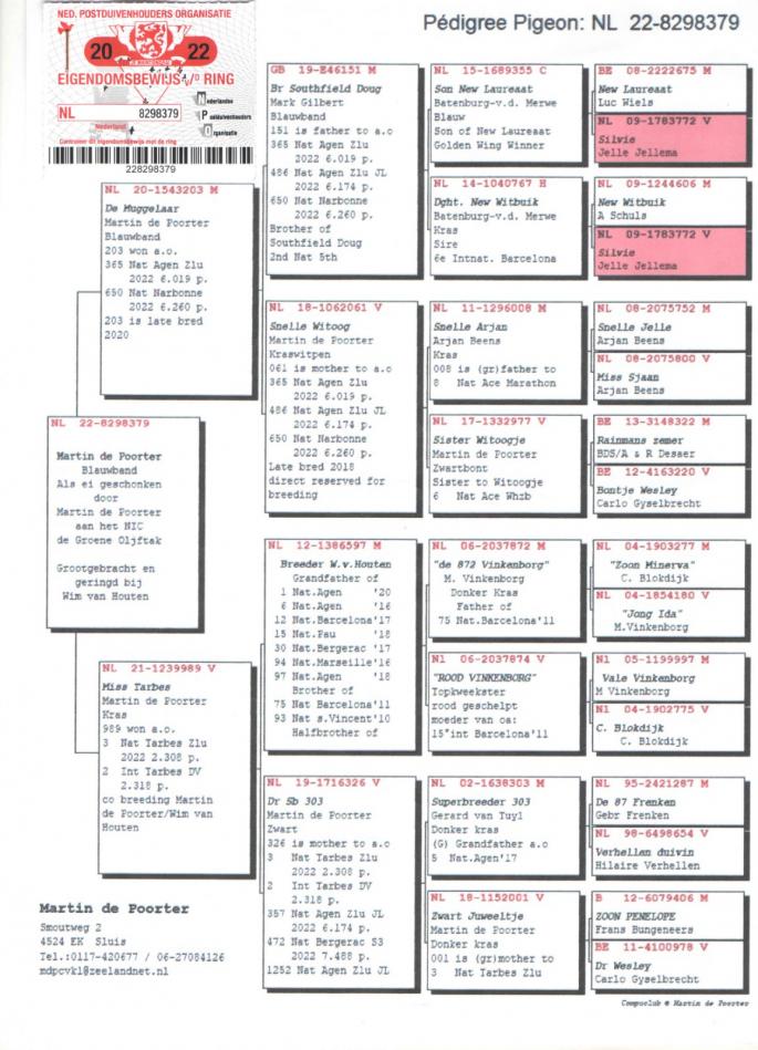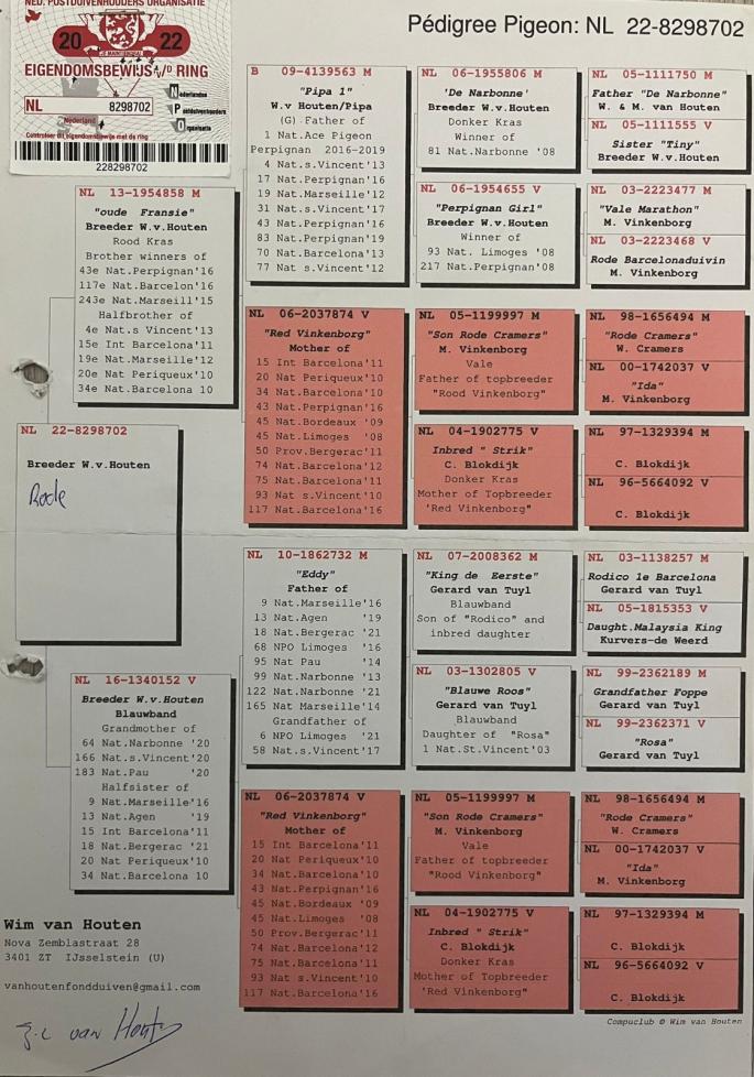 Nepot PIPA 1 - SUPER REPRODUCATOR Tata si bunic la : 1 Nat. Ace Pigeon Perpignan 2016-2019 4 Nat. St. Vicent `13 17 Nat. Perpignan `16 19 Nat. Marseille `12 31 Nat. S. Vicent `17 43 Nat. Perpignan `16 70 Nat. Barcelona `13 77 Nat. S. Vicent `12 83 Nat. Perpignan `19