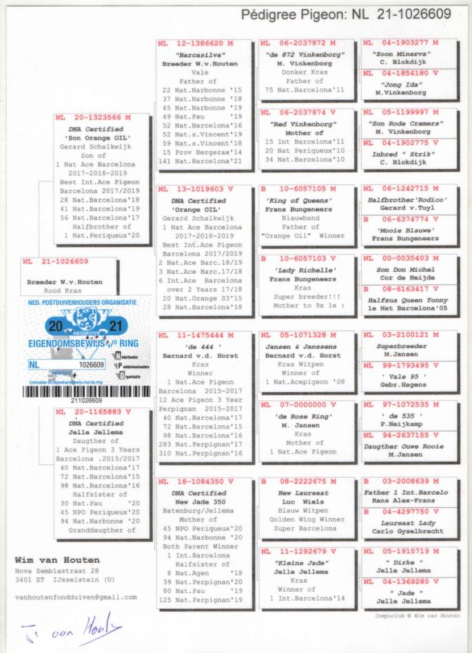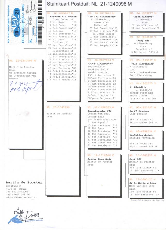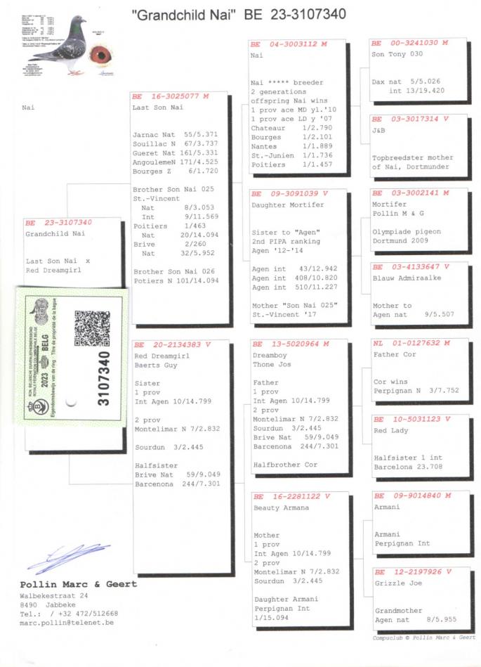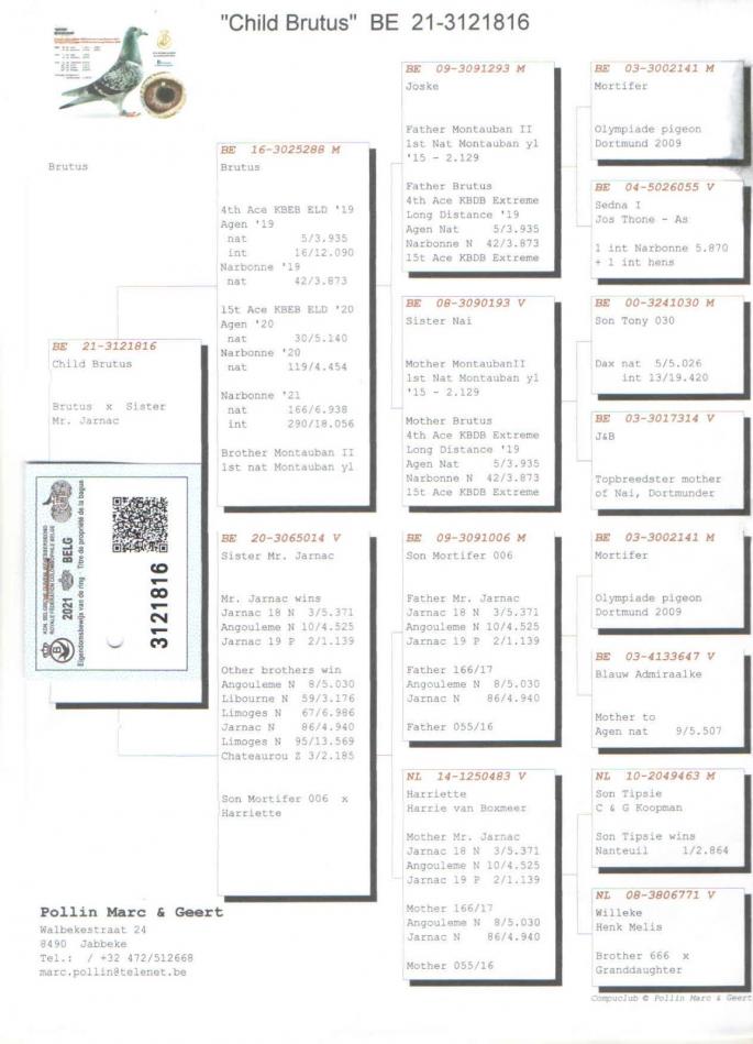 Fiica JOSKE - SUPER REPRODUCATOR Tata lui MONTAUBAN II 1st Nat. Montauban YL 2015 2129 p. BRUTUS 1st Belgian Olimpiade Pigeon ELD 2019-2020 4th ACE KBDB ELD 2019 15TH ACE KBDB ELD 2020 Bunicul lu` FURY 2nd ACE Pigeon KBDB Extrem L.D. YL 2015 2 / 2767 p. Agen Nat. 7 / 5890 p. Libourne Nat. SUNSHINE 1st NPO S4 Vierzon 699 km 5774 p.