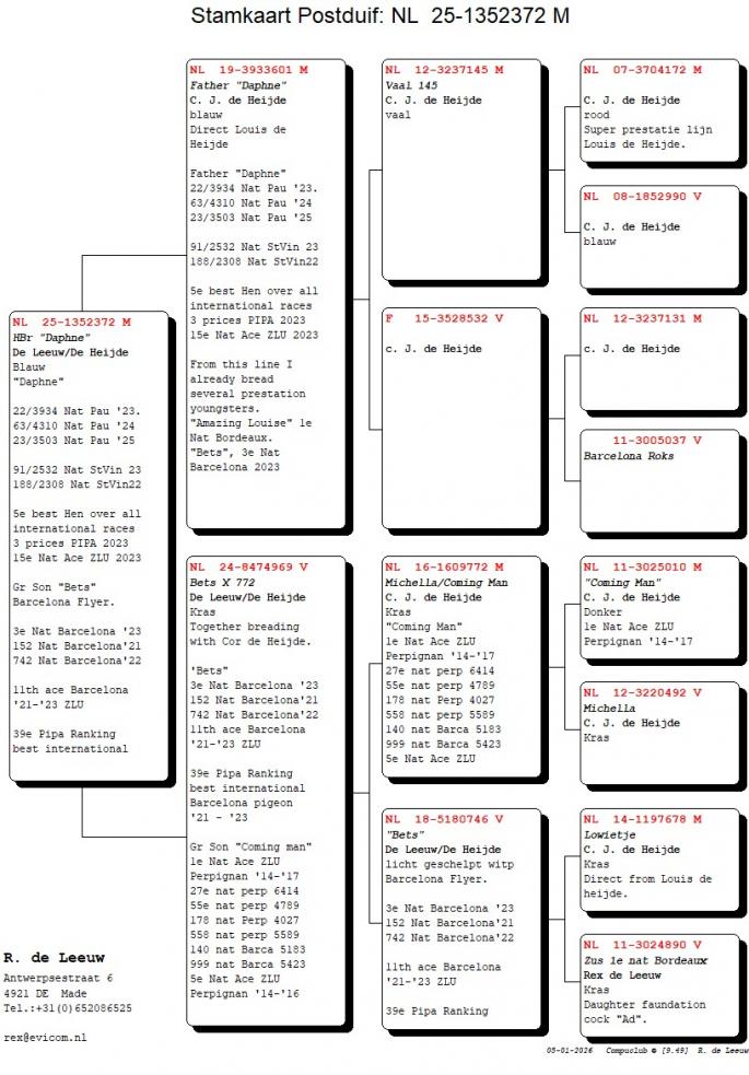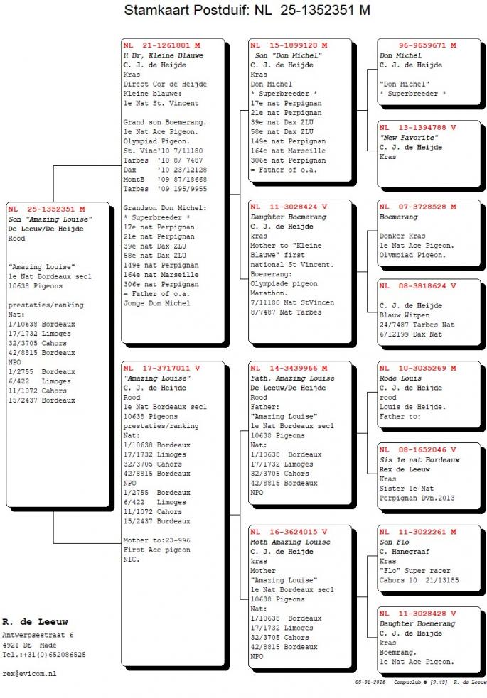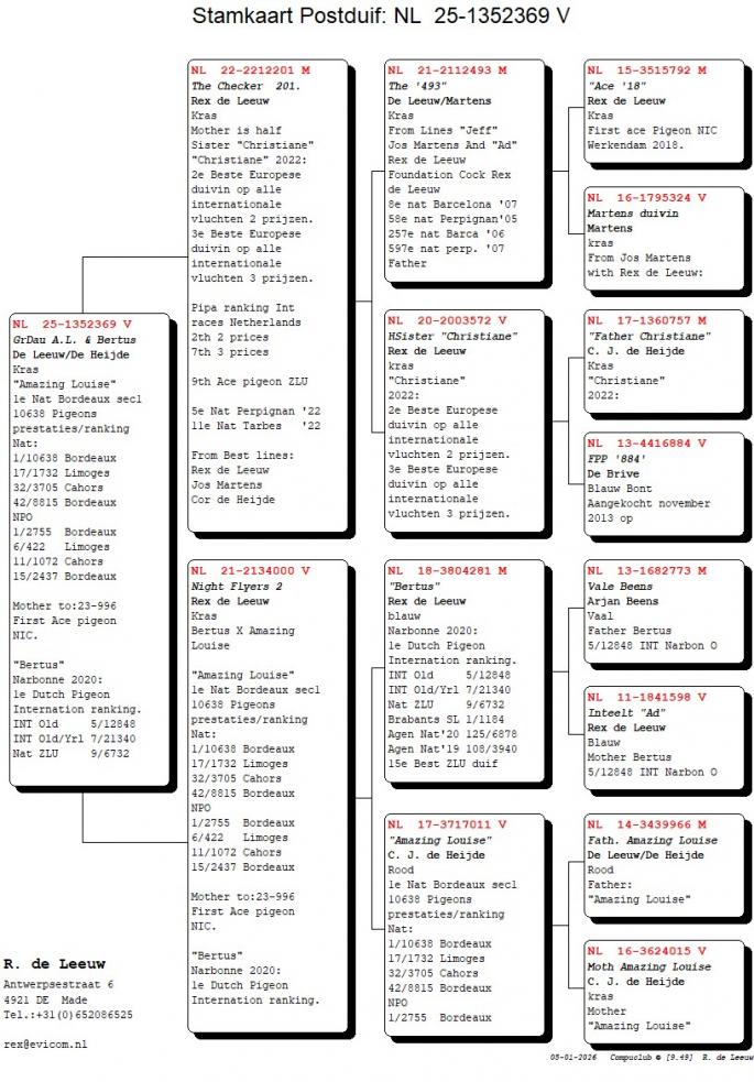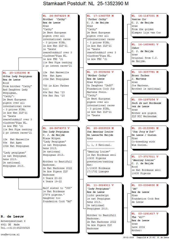 Rex de Leeuw a reusit sa-si construiasca un palmares impresionant, stabilindu-se ca o adevarata revelatie in lumea competitiilor de maraton. Inregistrand rezultate notabile precum 1. National Perpignan f. (2. National total), 1. National Bordeaux din 27.794 porumbei, 2. National Bordeaux din 18.023 porumbei, si 8. National Barcelona, Rex de Leeuw demonstreaza in mod constant calitati extraordinare in cadrul competitiilor.