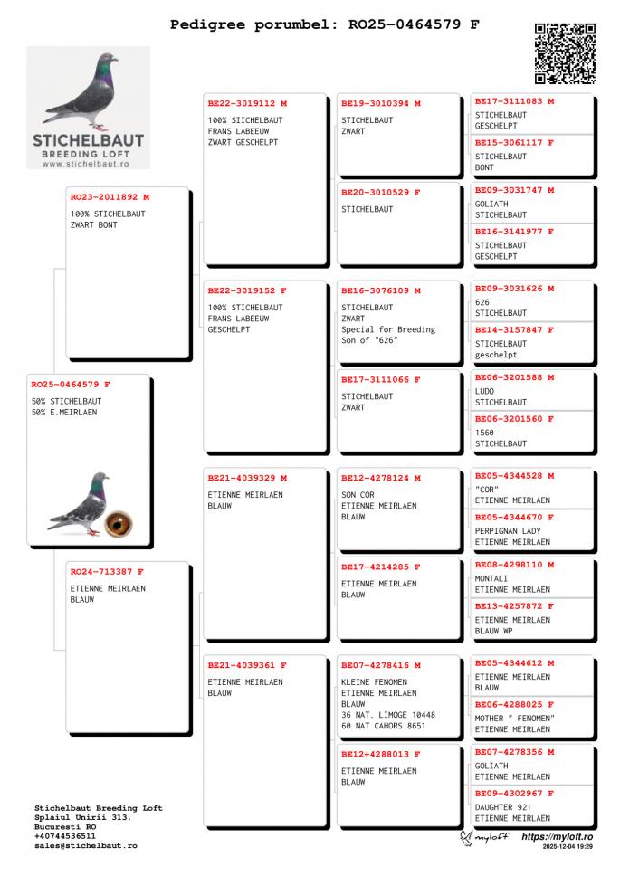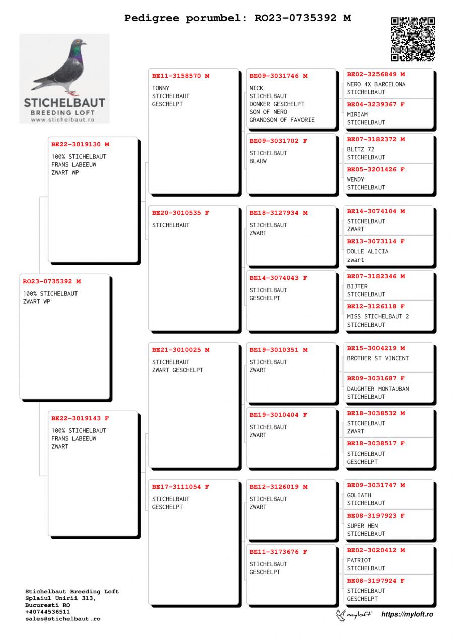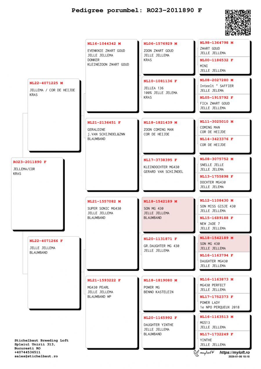 50% Stichelbout 50% Jele Jelema/ Cor de Heijde Tata 100% Stichelbaut Linie Mountanban, Bijter, Nero Nero 4 x Barcelon In pedigreul mamei gasim urmatorii porumbei: Zvart Goud, Coming Man Snele Jelle, MG 430..etc oferta curenta: - |