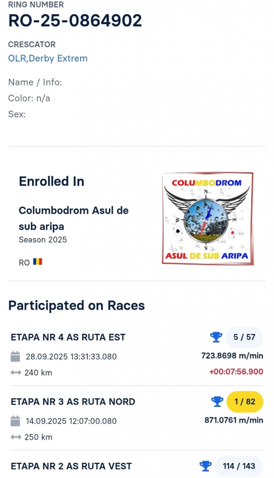 SUPER SUPER ZBURATOARE ZBURATA IN 4 PUNCTE CARDINALE SOSIRI TOPP !! HP 1 VEST LOC 48 HP 1 NORD LOC 66 HP 1 EST LOC 3 ETAPA NR 2 AS LOC 114 RUTA VEST ETAPA NR 3 AS LOCUL 1 RUTA NORD ETAPA NR 4 AS LOC 5 RUTA EST Sora cu RO-25-0864801 O.L.R PIRATE FR VERRY HARD SEASON Race 1 476/1195 P Race 2 311/581. P RACE 3 5/637. P SEMI-FINAL 204/549 P FINAL RACE CAEN 510 KM 221/539 P Ace pigeon 159/1506 P. RO-25-0864899 CAMPIONAT FCPR CHAMPIONS LEAGUE oferta curenta: - |