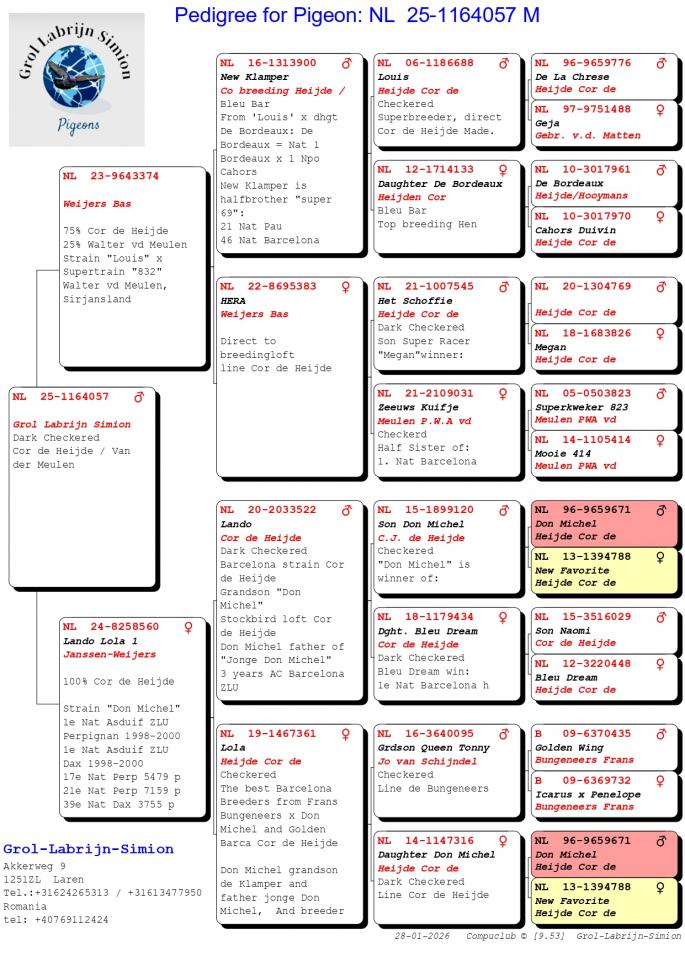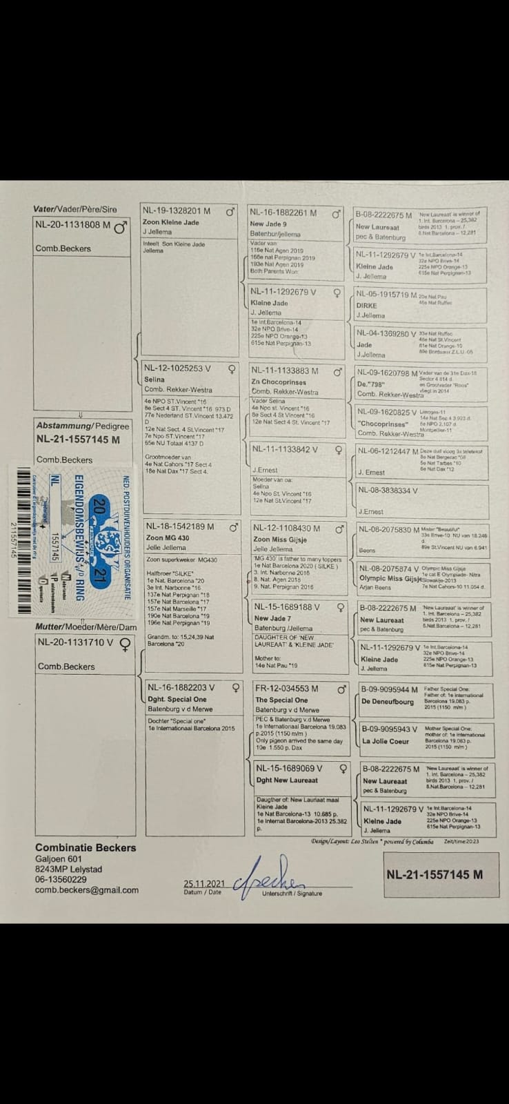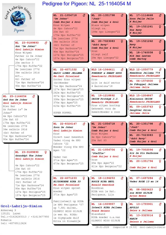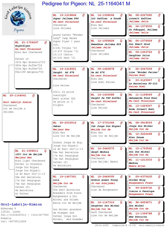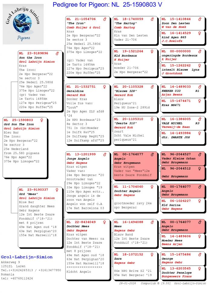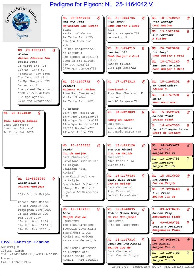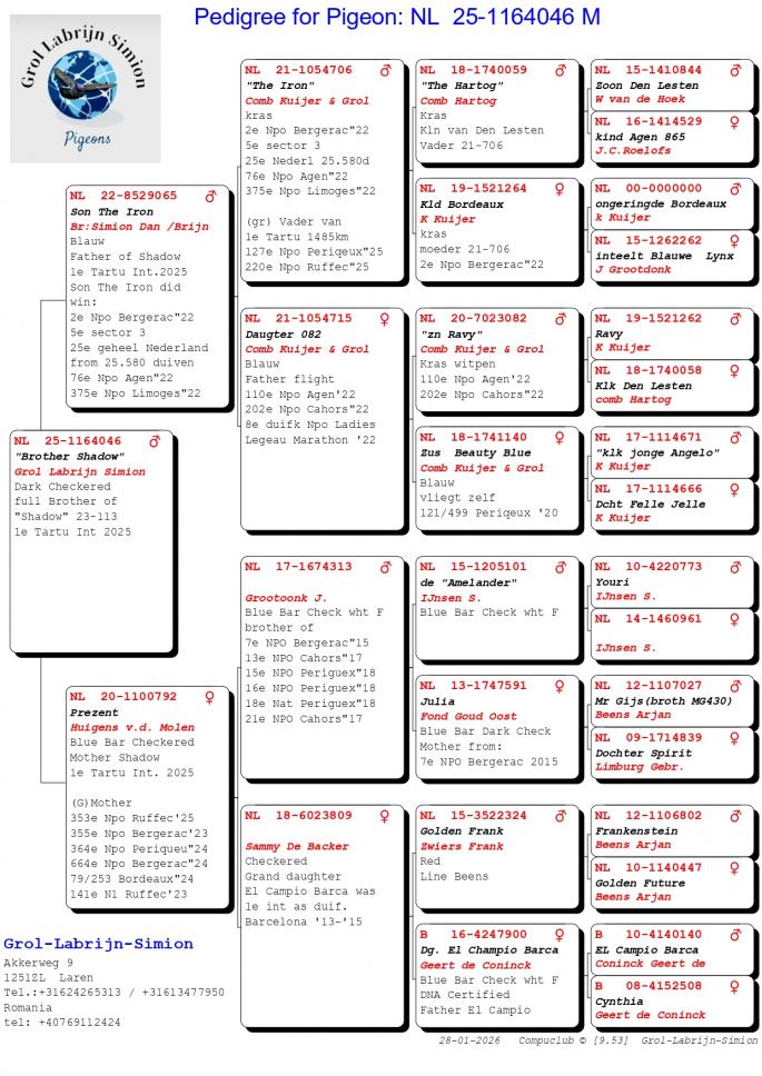 CombinaÈ›ia olandez-română relativ tanara Grol-La Brijn-Simion continuă să impresioneze prin rezultate excepÈ›ionale atât în Olanda, cât È™i în România. În 2025, la maratonul internaÈ›ional Tartu – 1487 km, au dominat clasamentul: locurile 1, 3, 4, 7,13,20,28,48,60 etc È™i multe altele – o performanță remarcabilă la o distanță extremă! Nepotul celebrului The Iron (loc 2 NPO Bergerac) a câÈ™tigat zborul, confirmând valoarea liniei de sânge.