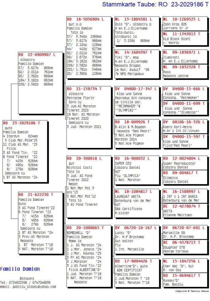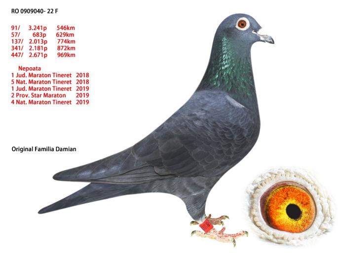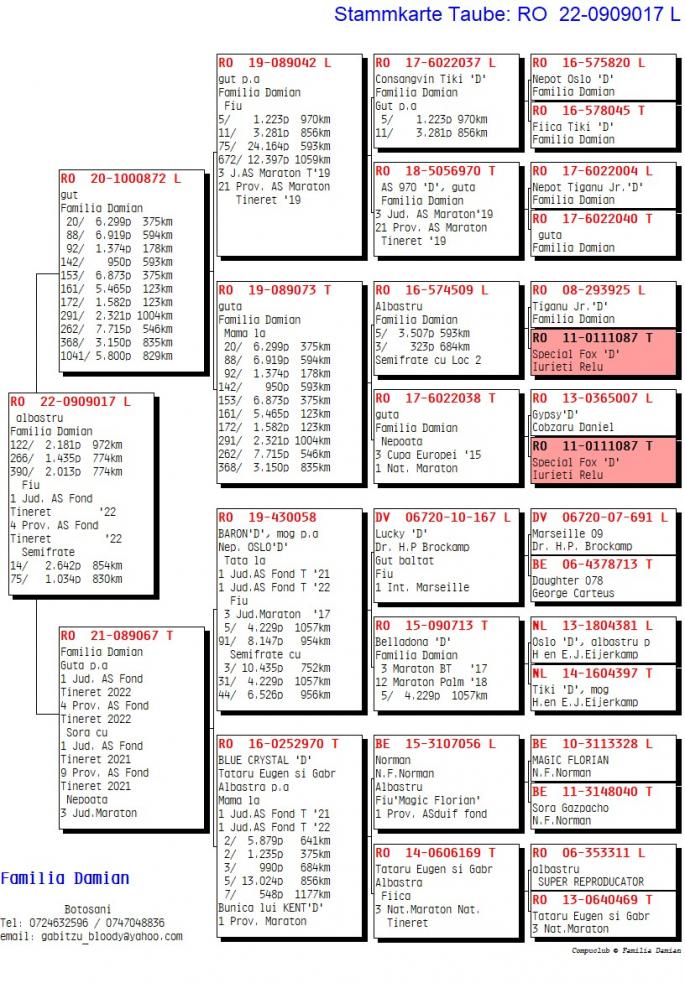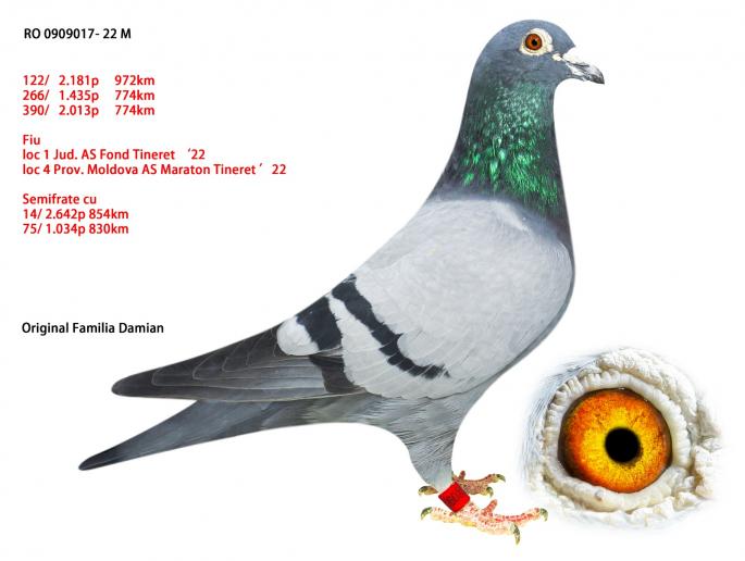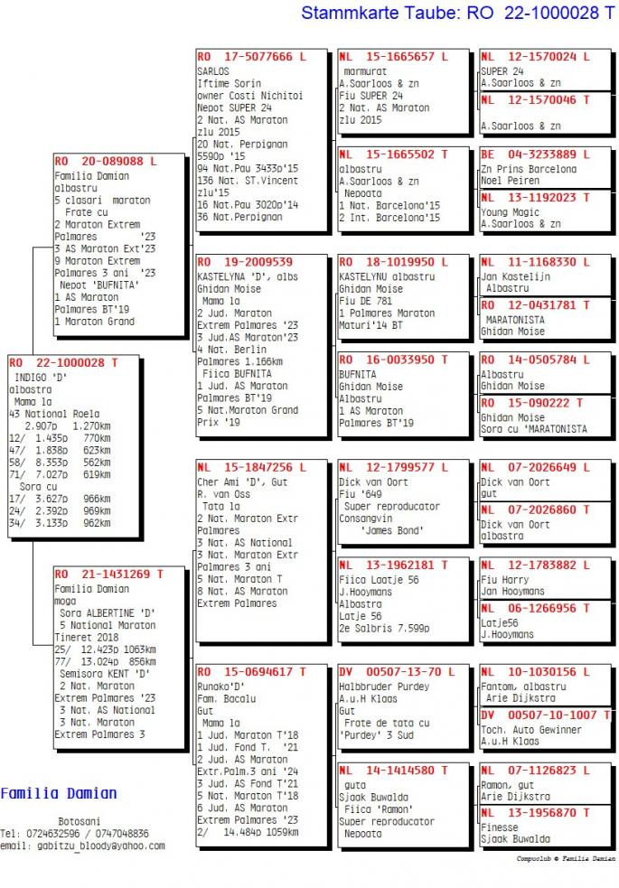 RO 1000028-22 este mama ala: 42 Nat. Roela 2907 p. 1270km 12 / 1435 p. 770km 47 / 1838 p. 623km 58 / 8353 p. 562km 71 / 7027 p. 619km Este sora cu: 17 / 3627 p. 966km 24 / 2392 p. 969km 34 / 3133 p. 962km