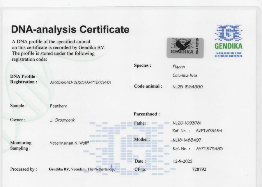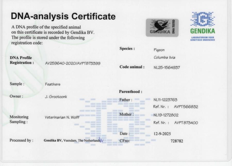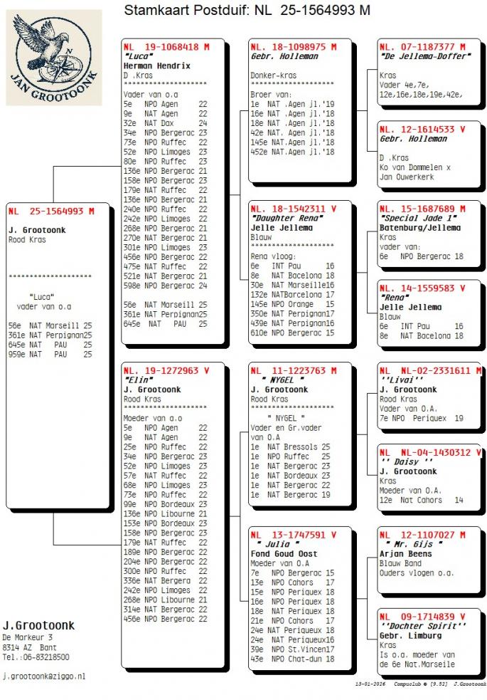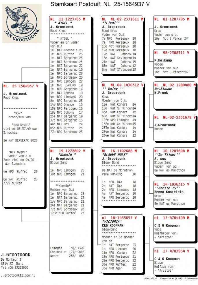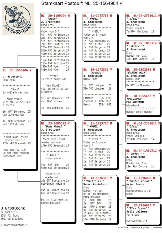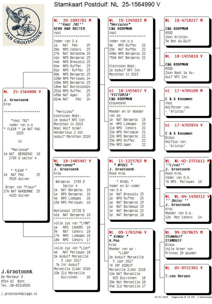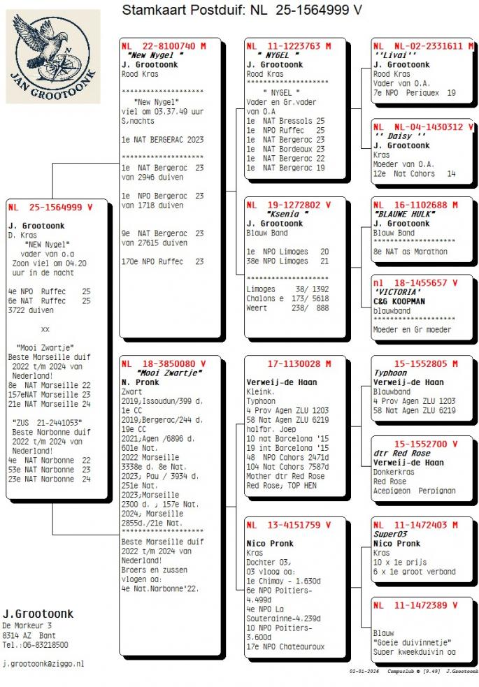 Fără nicio îndoială, Jan Grootoonk este unul dintre marile nume ale columbofiliei de maraton din Olanda. El È™i-a construit propria linie de porumbei prin încruciÈ™area porumbeilor săi de bază Nico Volkens/Sam de Jong cu porumbeii moderni Jellema/Beens È™i a avut un succes remarcabil, aÈ™a cum o demonstrează rezultatele din anii 2019–2020: