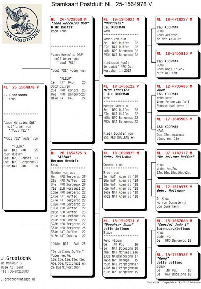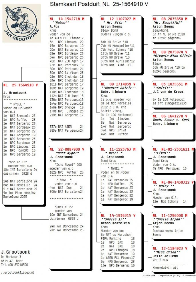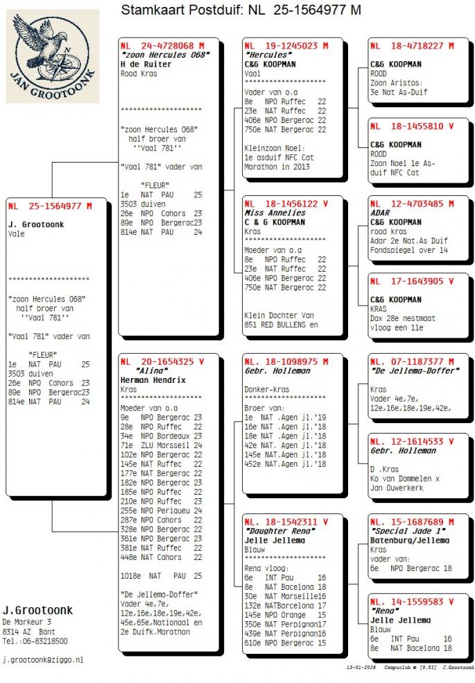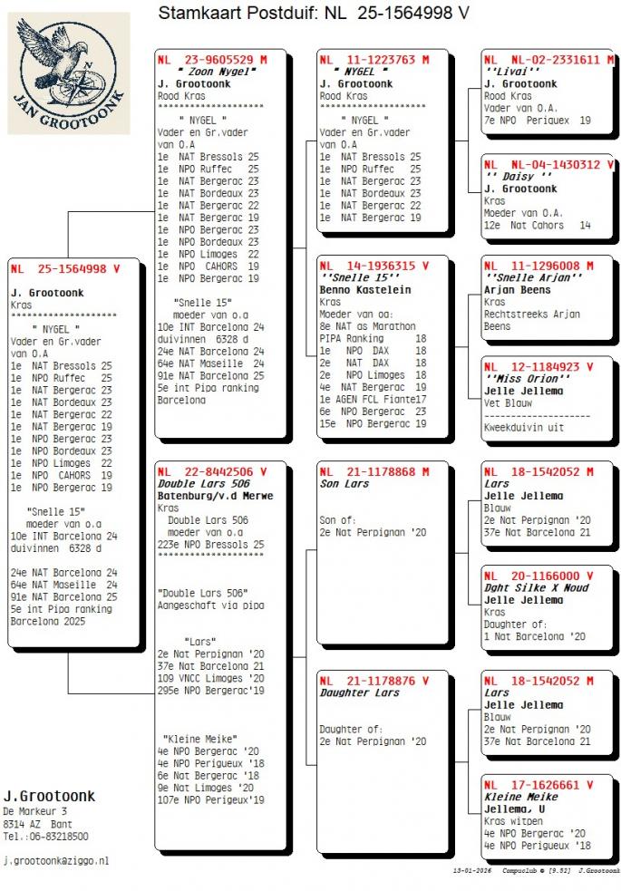 Jan este mereu în căutare de porumbei pentru a-i încruciÈ™a cu reproducătorii săi bazaÈ›i pe Nico Volkens È™i, de-a lungul anilor, a introdus porumbei de la Jelle Jellema (direct È™i prin KC Friesland & van der Veer), Arjan Beens (direct È™i prin Appie Pas & Henri Hoeks), fraÈ›ii Limburg È™i Kramer-Ouwehand. Privind rezultatele uimitoare de mai jos, se poate spune că această căutare a celor mai buni porumbei a fost extrem de reuÈ™ită.