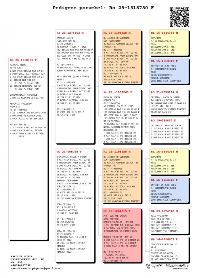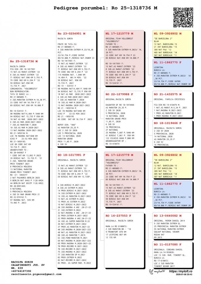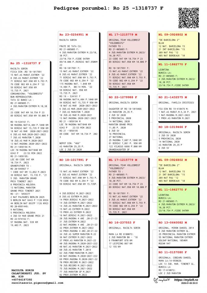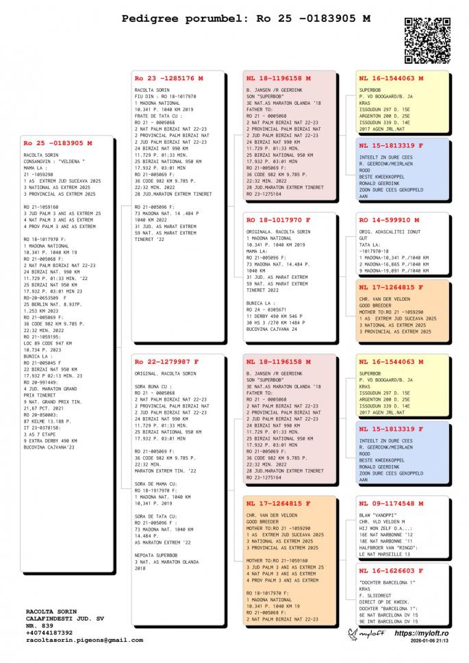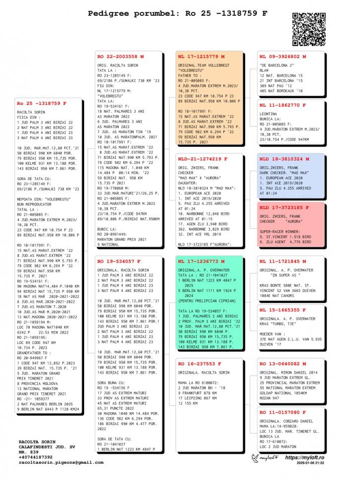 RO 21-005068 femela – Locul 2 National Palm Birzai National – 2022-2023 – Locul 24 Birzai National, 990 km, 11729 porumbei, 01:33 min – 2022 – Locul 25 Birzai National, 950 km, 17932 porumbei, 03:01 min – 2023 oferta curenta: - |