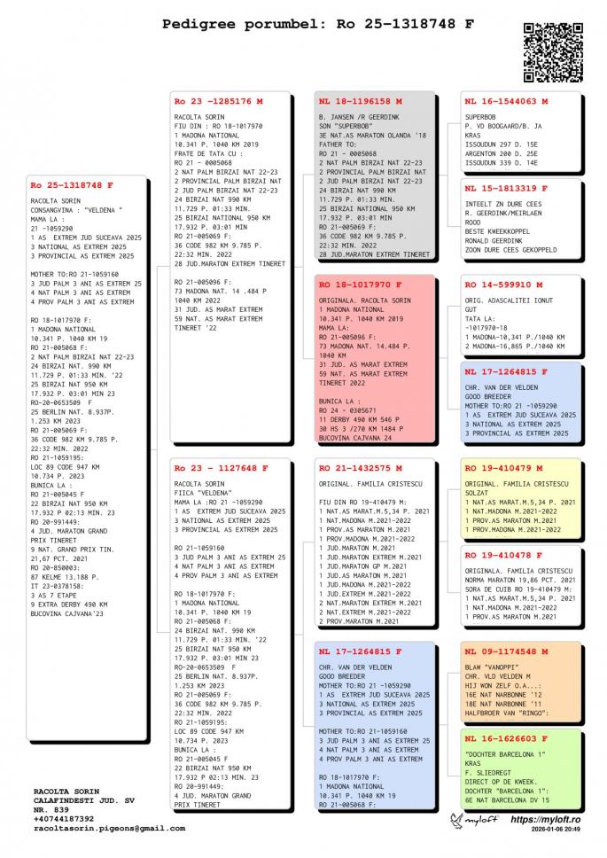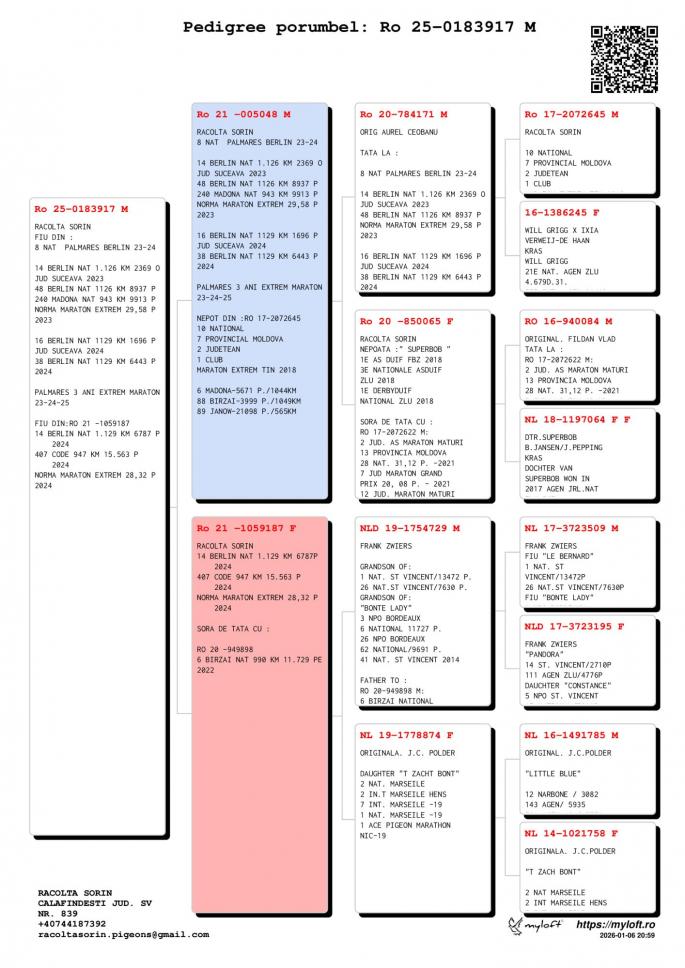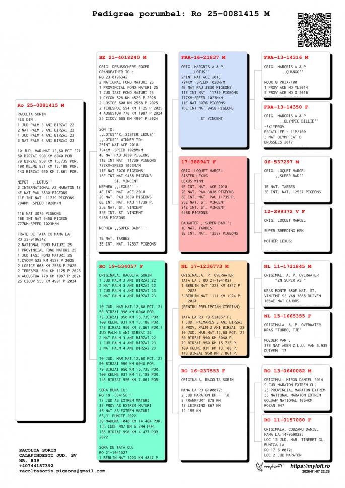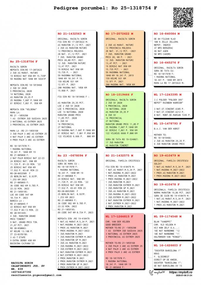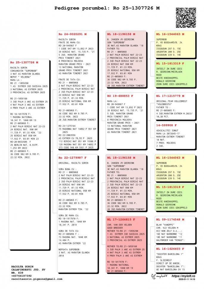 RO 21-005068 femela – Locul 2 National Palm Birzai National – 2022-2023 – Locul 24 Birzai National, 990 km, 11729 porumbei, 01:33 min – 2022 – Locul 25 Birzai National, 950 km, 17932 porumbei, 03:01 min – 2023 oferta curenta: - |