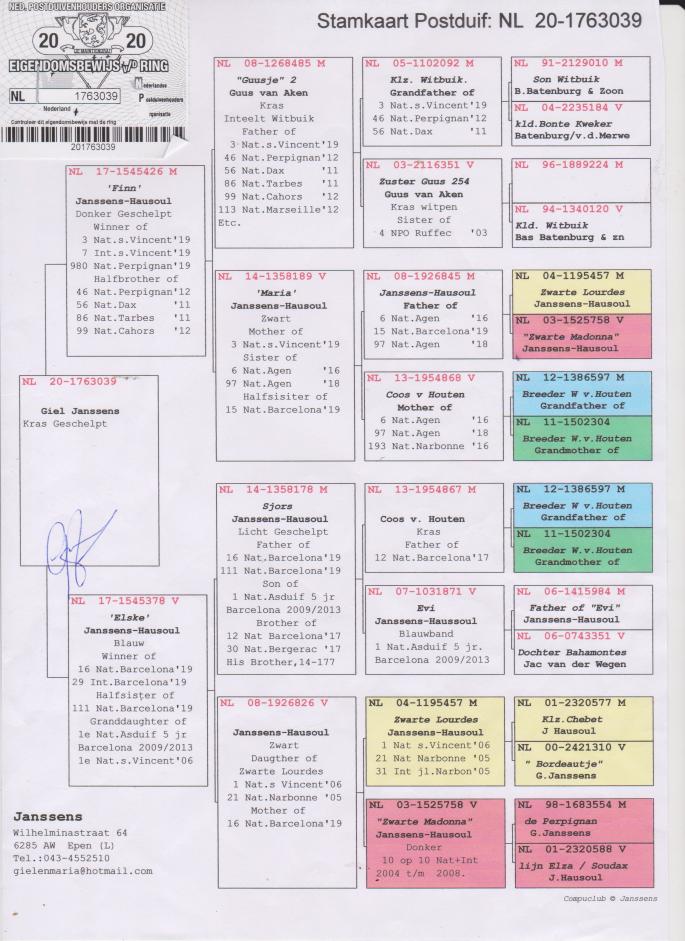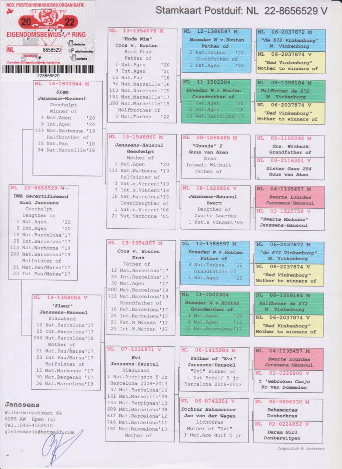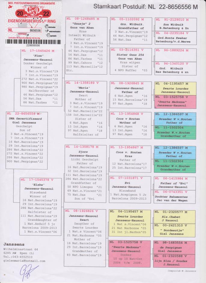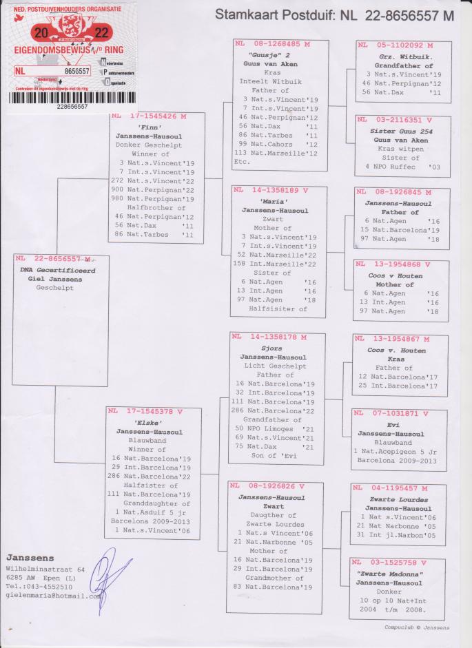 Fiu Juweeltje 16 Nat Narbonne 17 6 Nat femele barcelona 17 31 Int Barcelona 17 10 Int femele 17 686 Nat Barcelona 18 Nepoata Evi 1 Nat. Acepigeon 5 Jr Barcelona 2009-2013