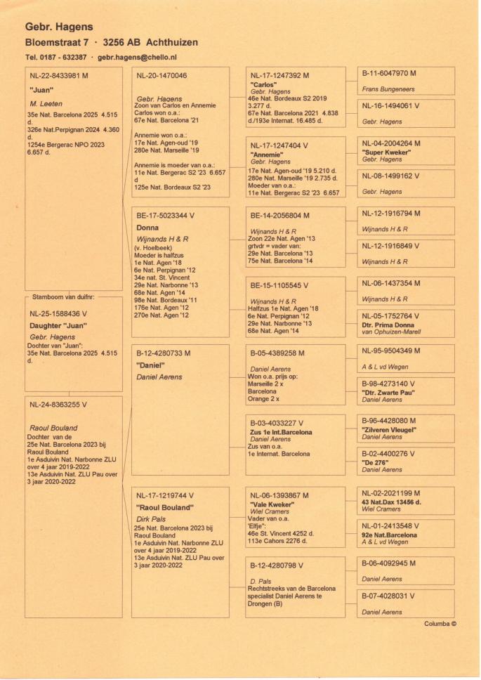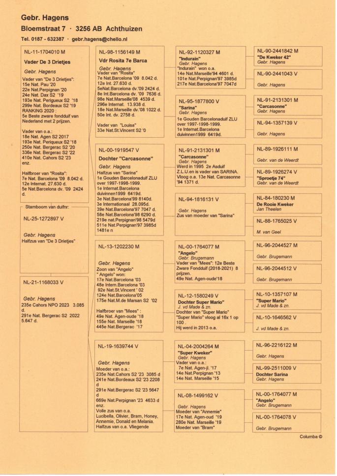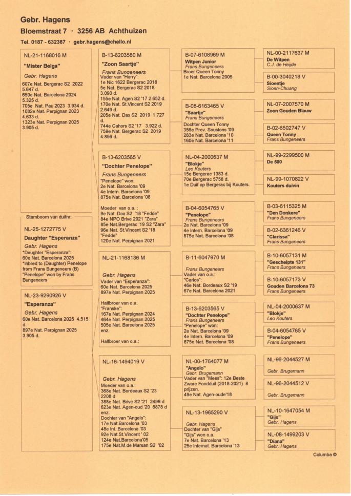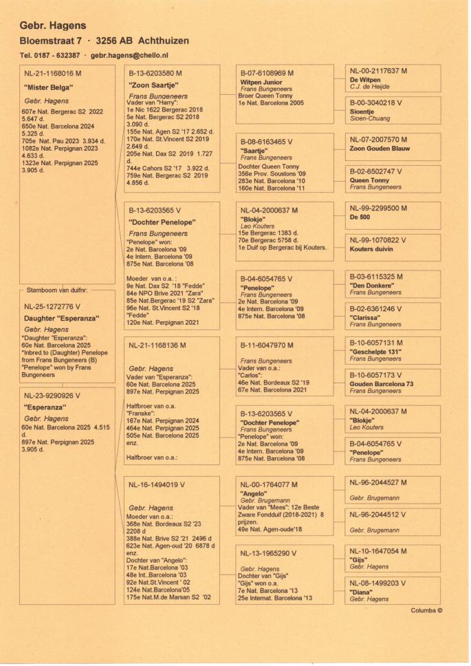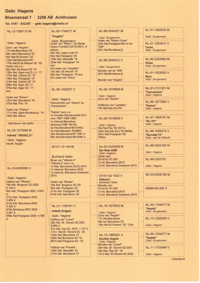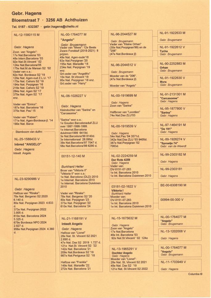 Cu totii am auzit despre marii maratonisti ai Europei, Fratii Hagens si celebrul lor porumbel Angelo. Aici vorbim despre o istorie columbofila pe care cei doi frati au scris-o de-a lungul intregii lor activitati. Este greu de gasit o crescatorie cu atatea rezultate de top obtinute constant timp de peste 30 de ani, dar si mai greu este sa gasesti o crescatorie cu atatea referinte de valoare precum cea a Fratilor Hagens.