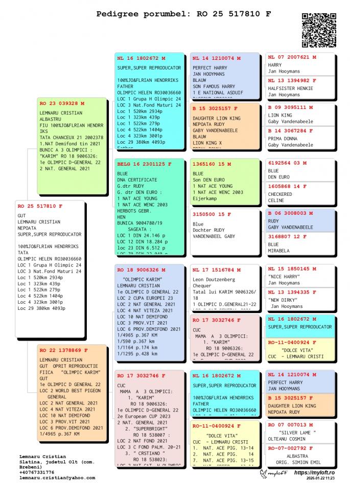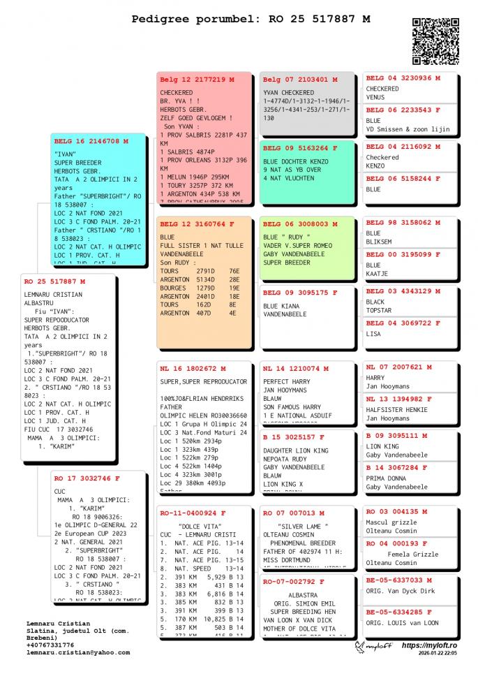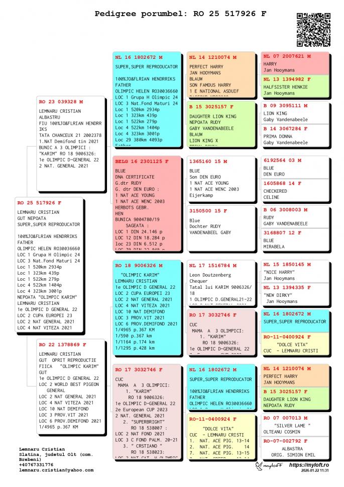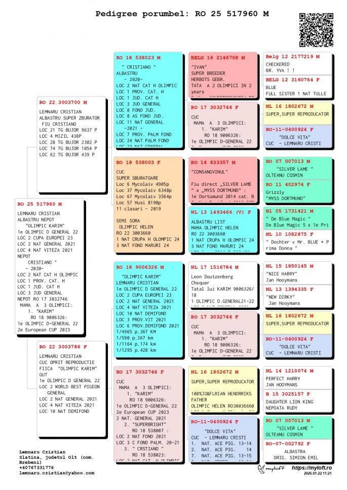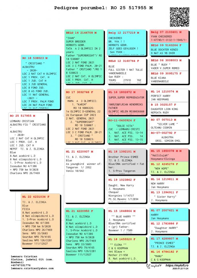 Nepoata si stranepoata NL 16-1802672 M - SUPER REPRODUCATORUL-Jo & Florian Hendriks - Unul dintre cei mai buni reproducatori din Europa ! Tatal mai multor porumbei Olimpici din Romania ! Tata la : OLIMPIC HELEN Loc 1 Grupa H. Olimpic 2024 Loc 3 Nat. Fond Maturi 2024 1 / 2934 p. 520 km 1 / 439 p. 323 km 1 / 279 p. 522 km 4 / 1404 p. 522 km 4 / 3001 p. 323 km CHANCEAUX 1 Nat. Demifond Tineret 2022 2 WBP Demifond 2022 1 Prov. Demifond Tineret 2022 1 Jud. Demifond Tineret 2022 1 Club Demifond Tineret 2022 1 / 1726 p. 385 km 1 / 978 p. 385 km 1 / 877 p. 385 km 25 / 11622 p. 425 km OLIMPIC KARIM Loc 1 Olimpic D. General 21-22 Loc 2 Cupa Europei 2023 Loc 2 Nat. General `21 Loc 4 Nat. Viteza `21 LOc 10 Nat. Demifond Loc 3 Prov. Viteza `21 Loc 6 Prov. Demifond `2 SUPERBRIGHT Loc 2 Nat. Fond 2021 Loc 3 Olimpic C Fond Palm. Loc 3 C. Fond Palm. 2 ani CRISTIANO Loc 2 Nat. Cat. H. OLIMPIC Loc 1 Prov. Cat. H Loc 1 Jud. Cat. H Loc 3 Jud. General Loc 8 Jud. Fond Loc 8 Jud. AS Fond