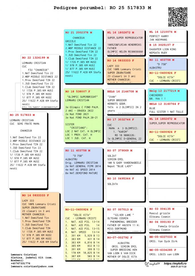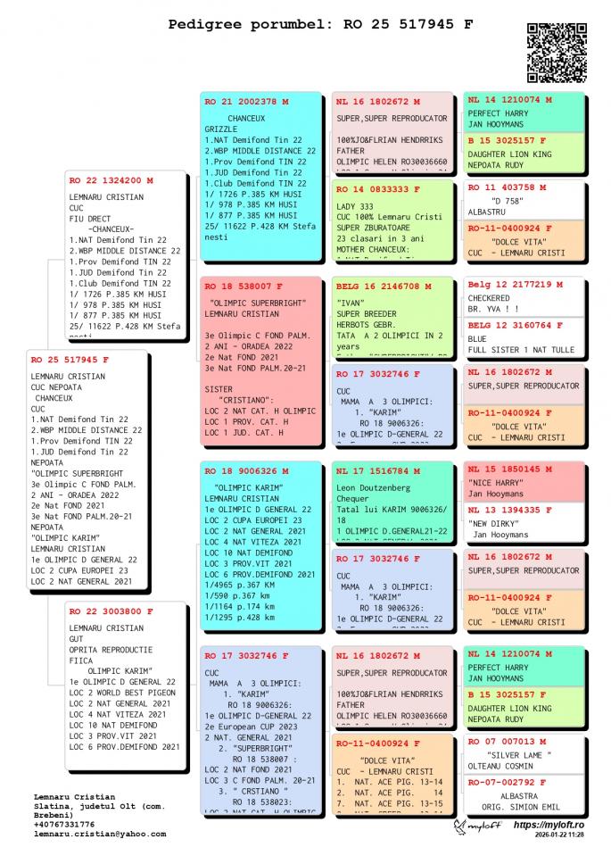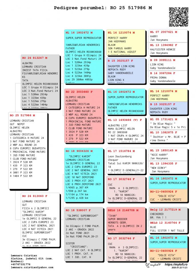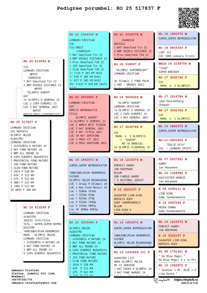 Fiu din RO 3003687-22M Loc 1 301 p. 136km Loc 2 2573 p. 520km Loc 9 1404 p. 522km Loc 21 216 p. 522km Frate bun cu OLIMPIC HELEN Loc 1 Grupa H. Olimpic 2024 Loc 3 Nat. Fond Maturi 2024 1 / 2934 p. 520 km 1 / 439 p. 323 km 1 / 279 p. 522 km 4 / 1404 p. 522 km 4 / 3001 p. 323 km
