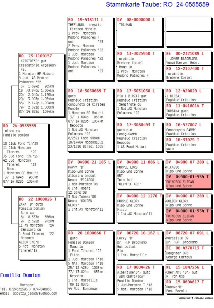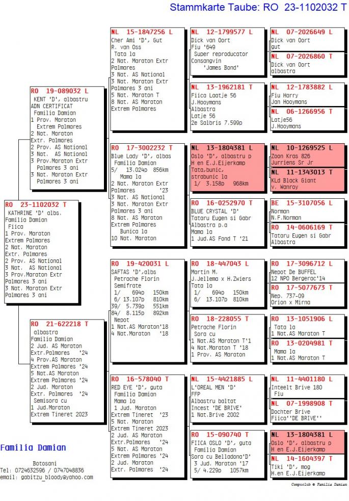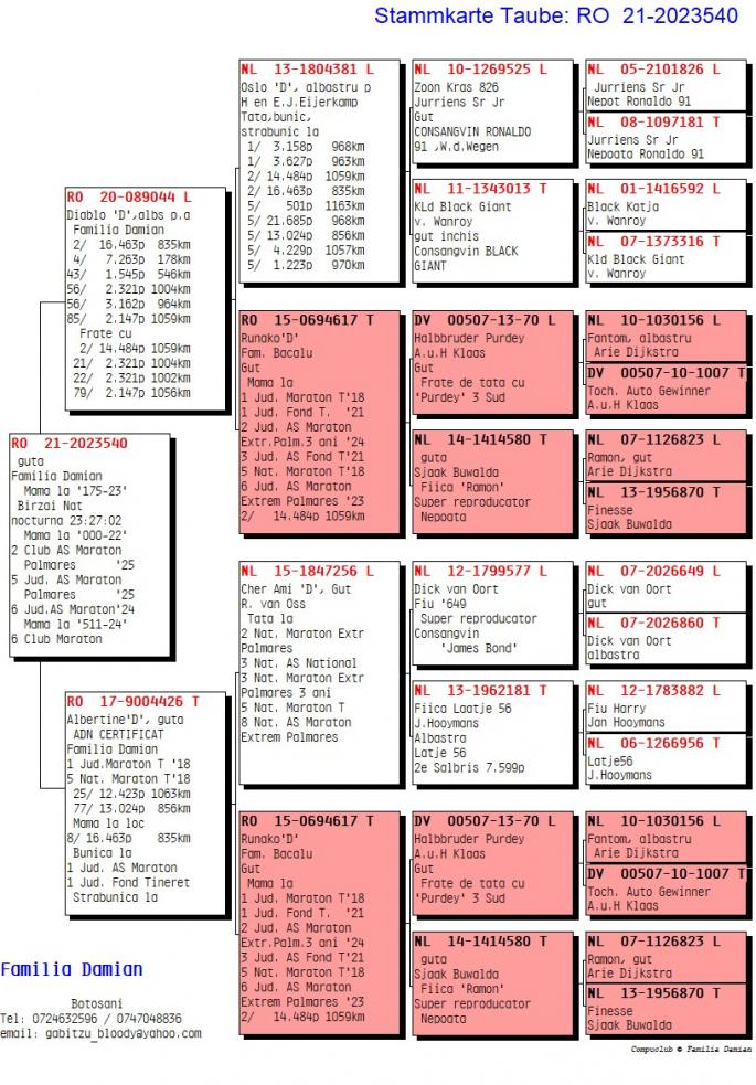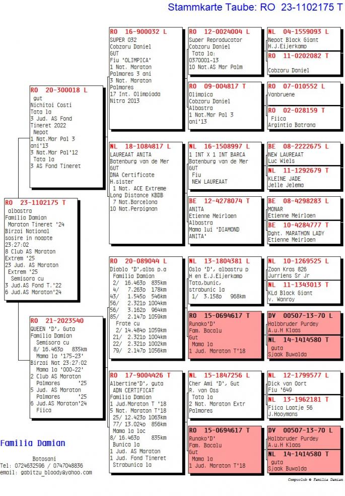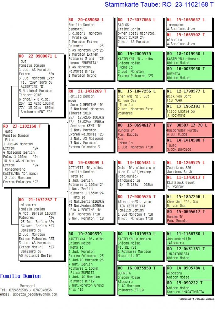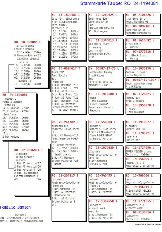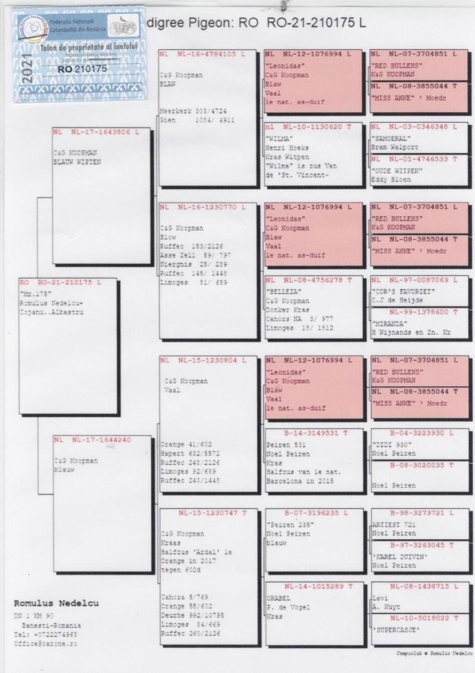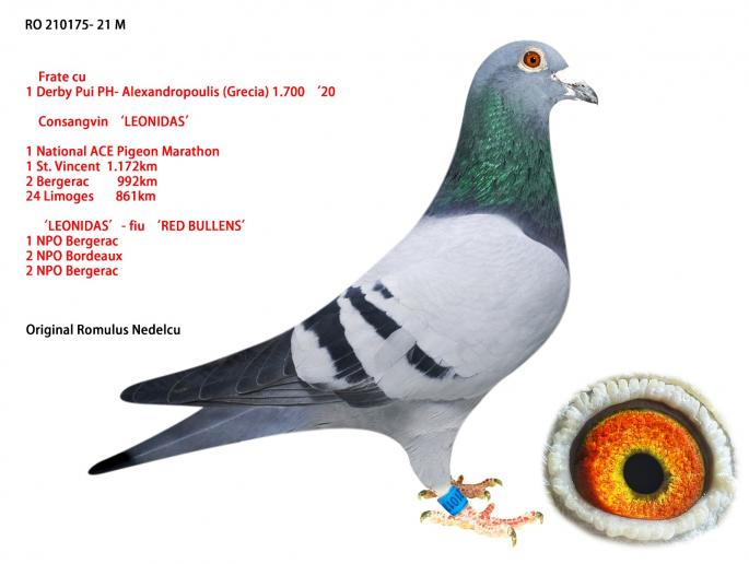 Consangvin Leonidas: 1 Nat. ACE Pigeon Marathon 1 St.Vincent 1172km 2 Bergerac 992km 25 Limoges 861KM Leonidas este fiu RED BULLENS: 1 NPO Bergerac 1 NPO BORDEAUX 2 NPO Bergerac oferta curenta: - |