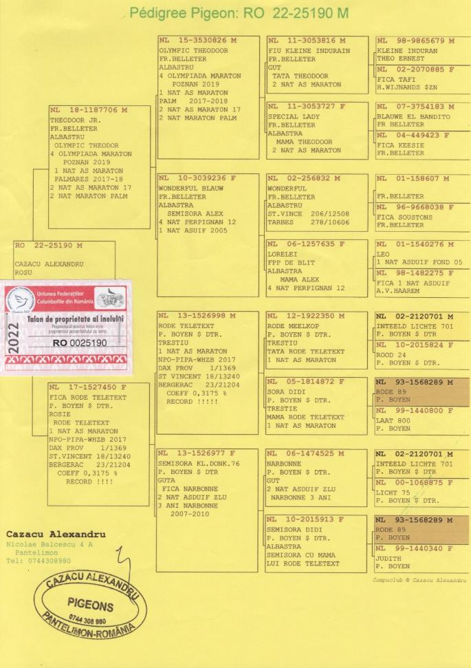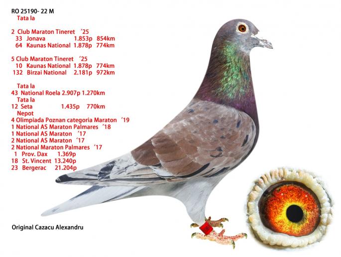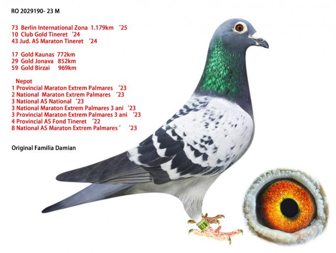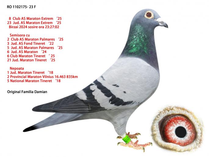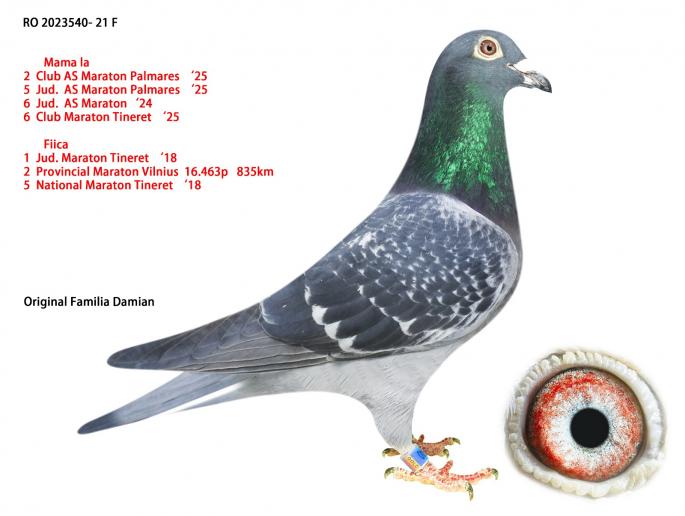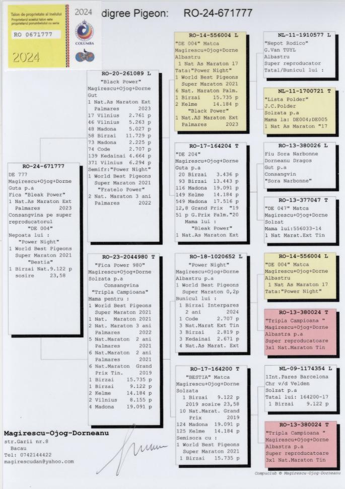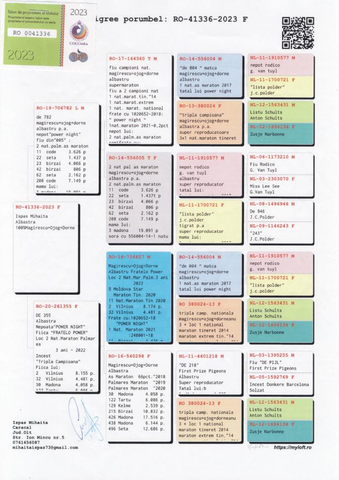 Fiica Black Power: 1 Nat. As Maraton Extrem – Palmares 2023 17 Vilnius – 2.761 p 46 Vilnius – 5.263 p 48 Madona – 5.027 p 58 Birzai – 11.729 p 73 Madona – 2.225 p 74 Code – 2.707 p 139 Kedainiai – 4.664 p 371 Vilnius – 6.294 p Semifrate cu „Power Night” 1 World Best Pigeons – Super Maraton 0.2 pct.