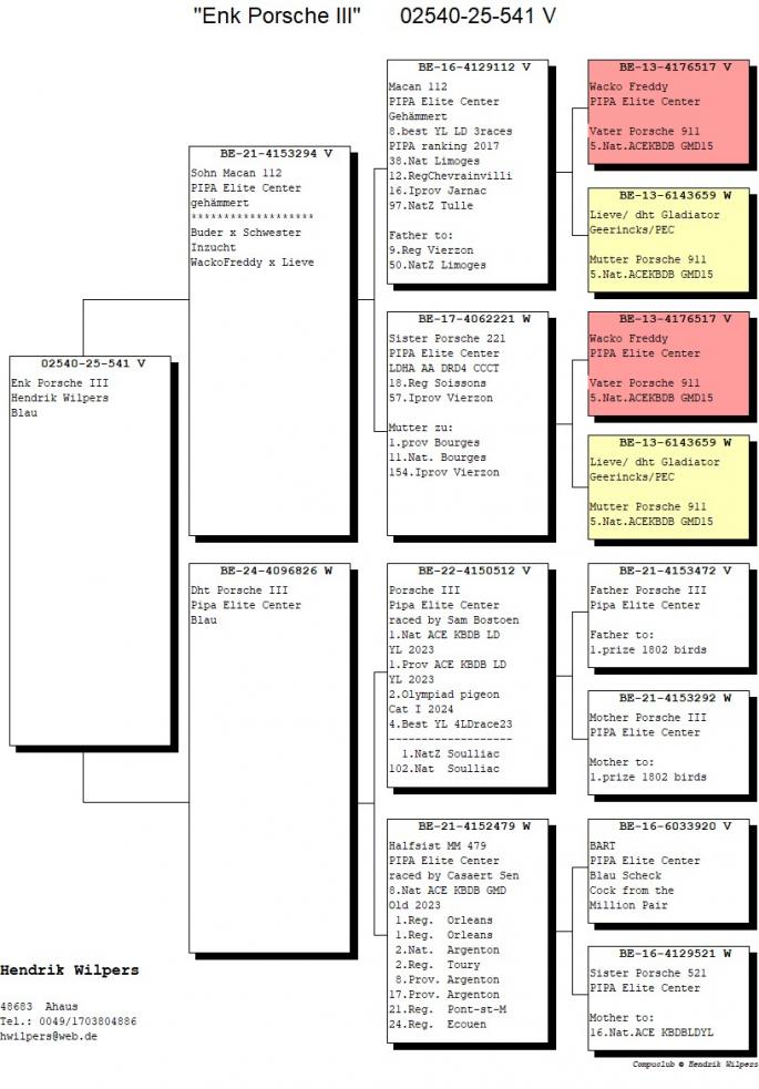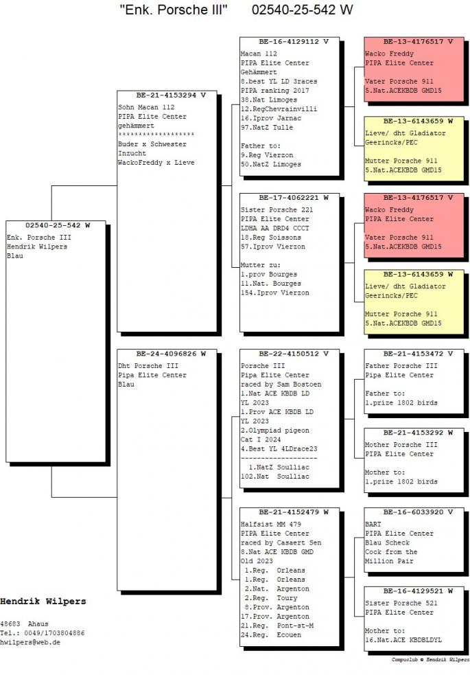 Nepoata Porsche III: 1 Nat. Ace KBDB LD YL 2023 1 Prov. Ace KBDB LD YL 2023 2 Olympiad pigeon cat I 2024 4 Best LD Race 2023 Nepoata Macan 112 8 Best YL LD 3 races Pipa ranking 2017 12 Reg Chevrainvilli 16 Iprov Jarnac 97 Nat.Z Tulle Tata la: 9 Reg Vierzon 50 NatZ Limoges