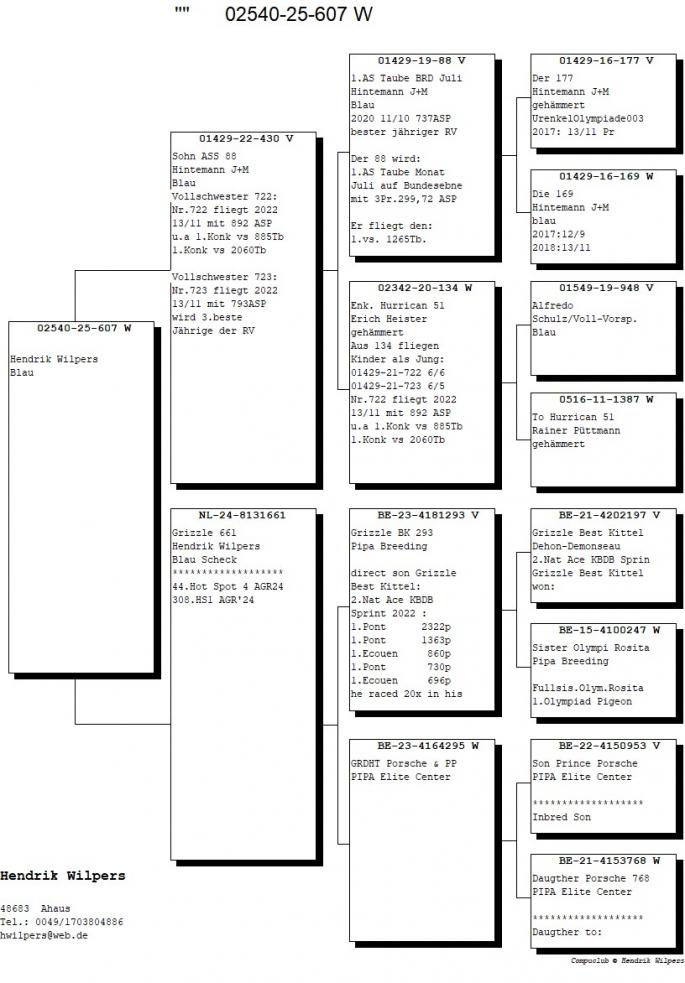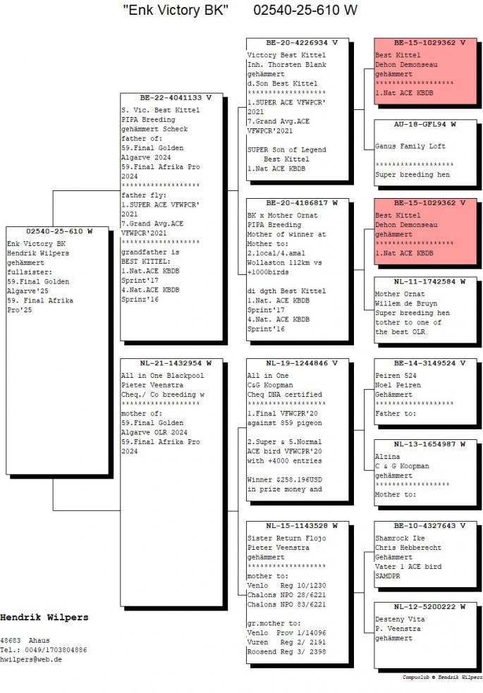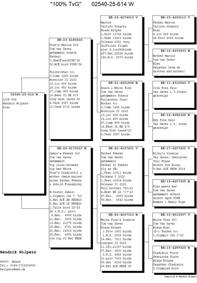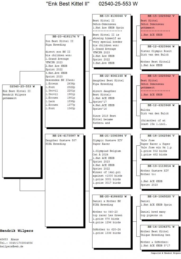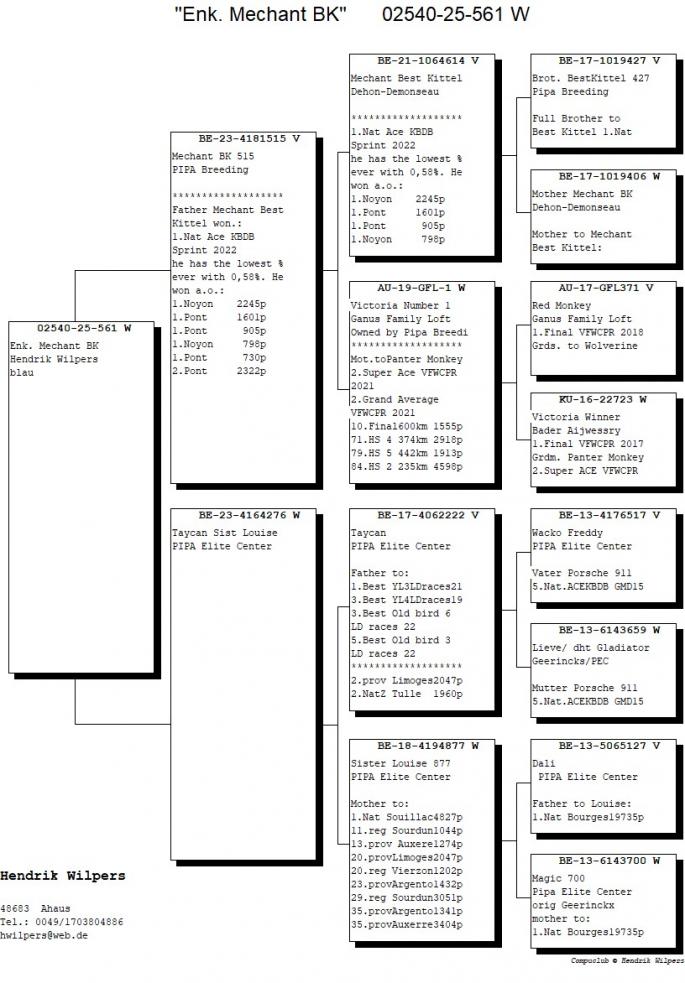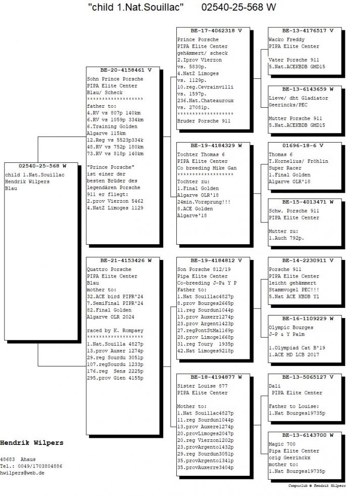 Tatal este frate cu: 2 Comb 1458 p.Montoire II 2023 13 / 606 p. 14 / 453 p. 27 comb 989 p. 16 Best YL BE 5/5 long distance race 2023 4 Vebr. 3357 p. 10 Vebr. 5718 p. Fiu Marcos: 1 Prov. 10762 p. 1 Fast 19203 p. Orleans 2021 etapa dificila
