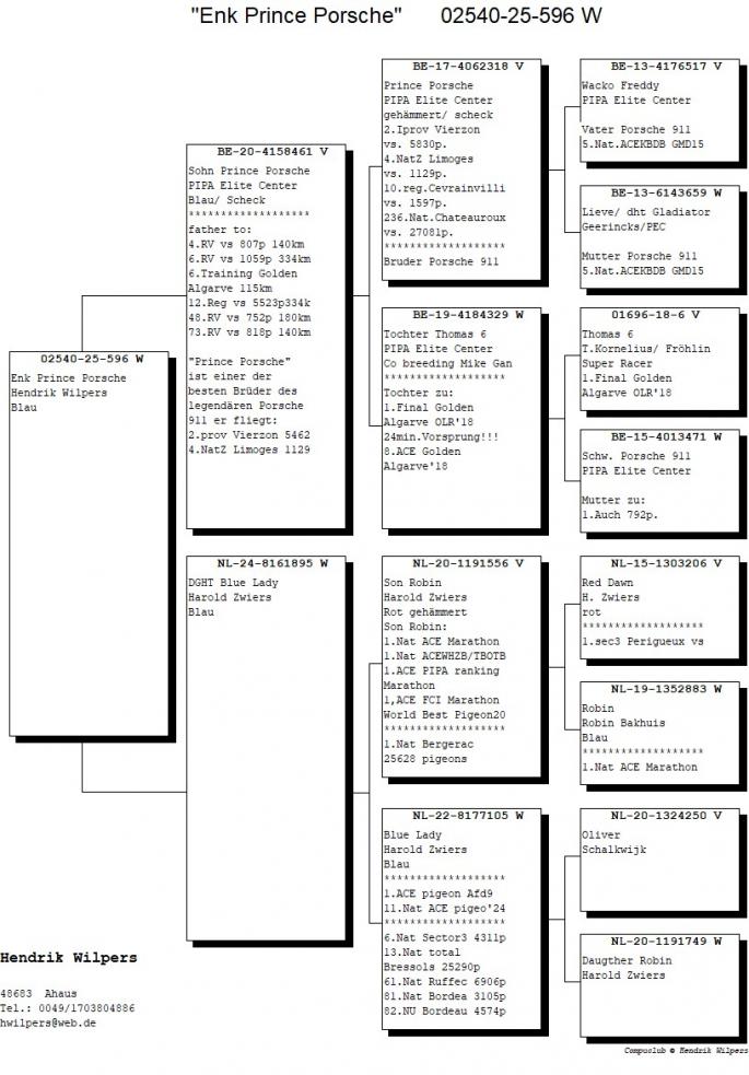 Nepot Porsche III: 1 Nat. Ace KBDB LD YL 2023 1 Prov. Ace KBDB LD YL 2023 2 Olympiad pigeon cat I 2024 4 Best LD Race 2023 Nepot Macan 112 8 Best YL LD 3 races Pipa ranking 2017 12 Reg Chevrainvilli 16 Iprov Jarnac 97 Nat.Z Tulle Tata la: 9 Reg Vierzon 50 NatZ Limoges