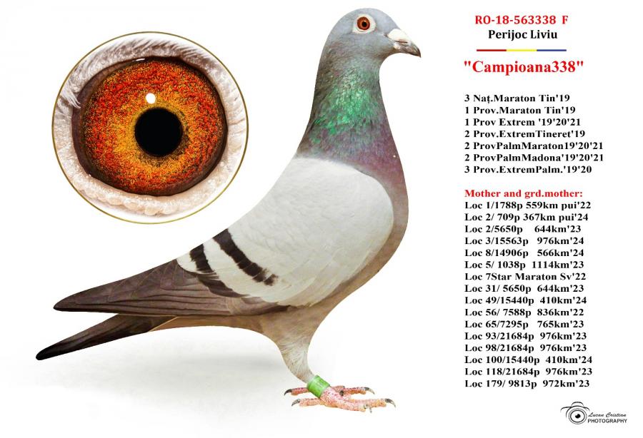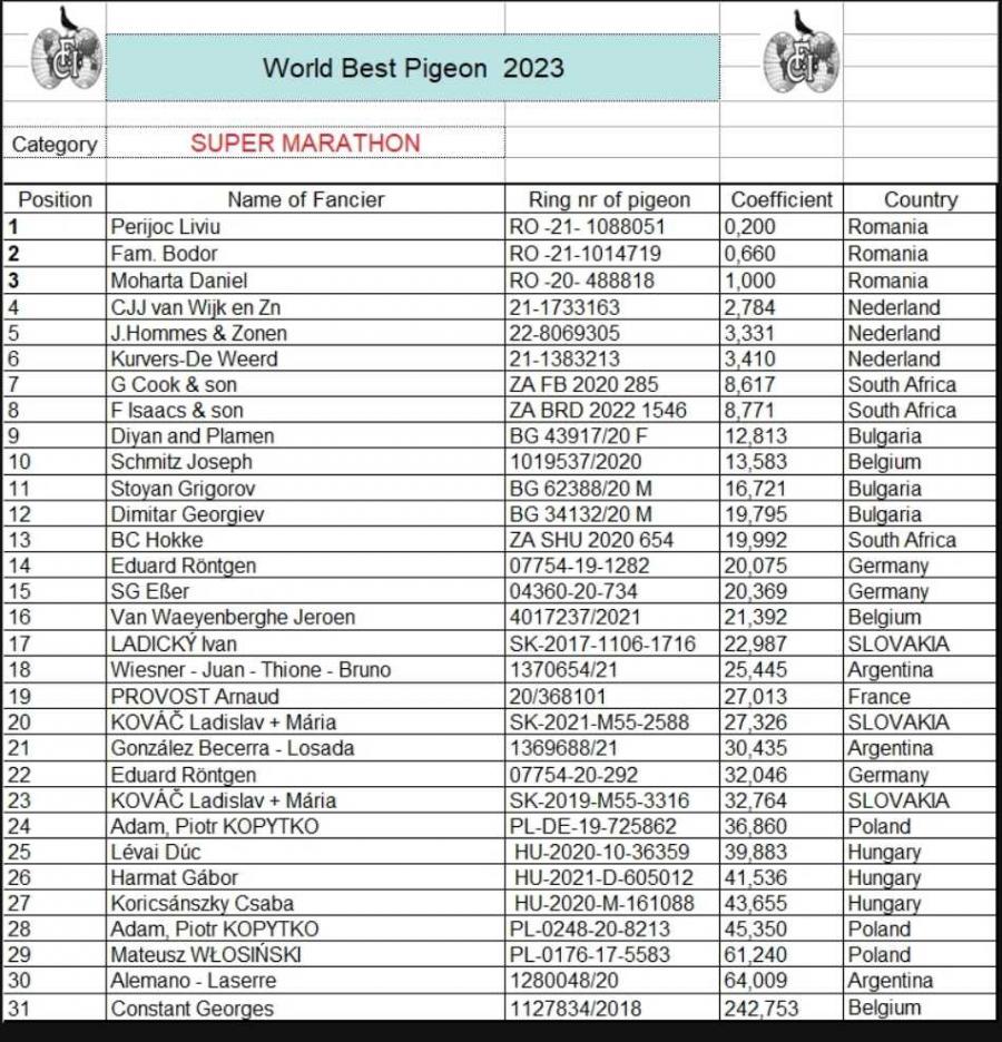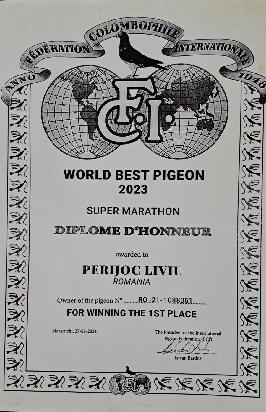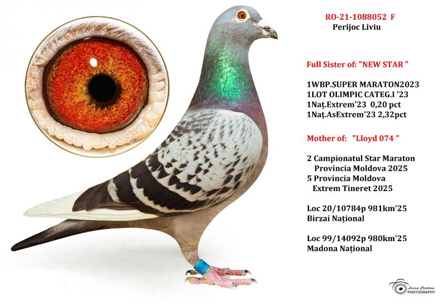 2 Campionatul Star Maraton Prov. Moldova 25 5 Nat. Extrem Tineret 25 Loc 20/10784p 981km Birzai National 25 Nepoata & Consangvina New Star 1 World Best Pigeon Super Maraton 2023 1 Nat. Extrem 23 0,20 pct 1 Nat. AS Extrem 23 2,32 pct 1 Lot Olimpic Categ. I 23 Loc 1/17932p Birzai 979km Loc 4/21684p Code 976km Loc 61/19403p Madona 972km Tata: Lloyd 074 Mama: Fiica New Star