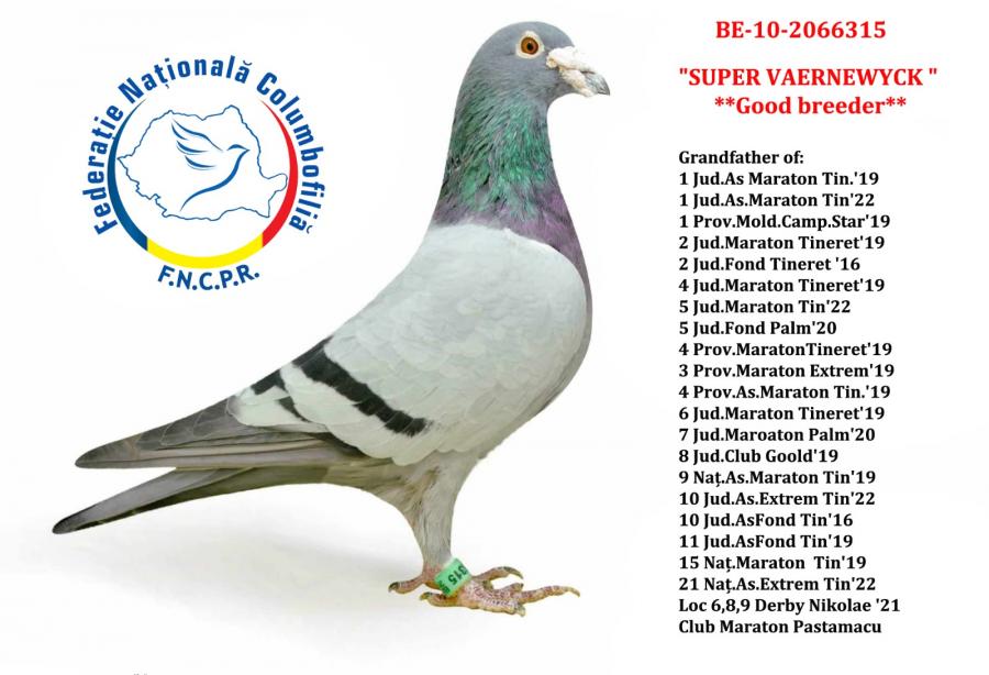 Super Vaernewyck este strabunic la New Star: 1 World Best Pigeon Super Maraton 2023 1 Nat. Extrem 23 0,20 pct 1 Nat. AS Extrem 23 2,32 pct 1 Lot Olimpic Categ. I 23 Loc 1/17932p Birzai 979km Loc 4/21684p Code 976km Loc 61/19403p Madona 972km