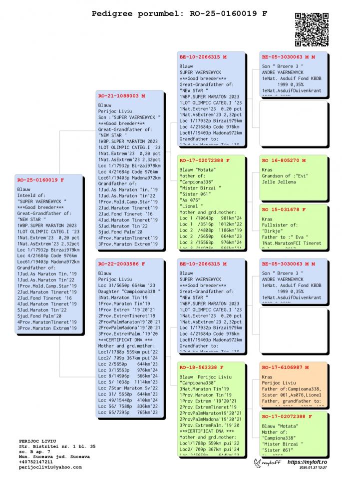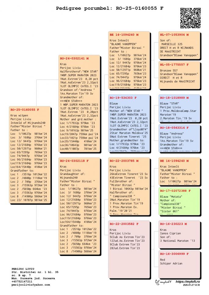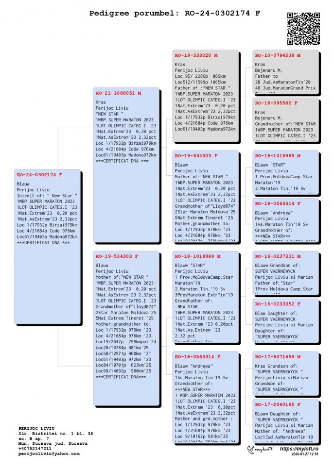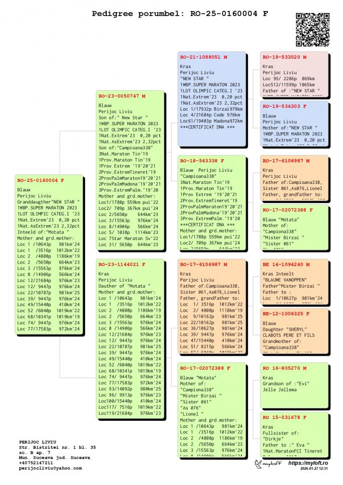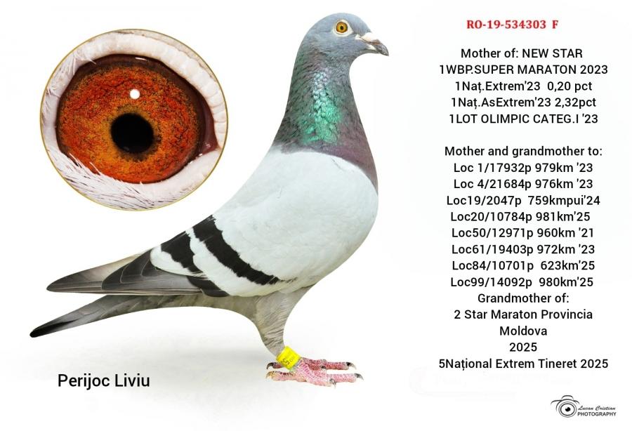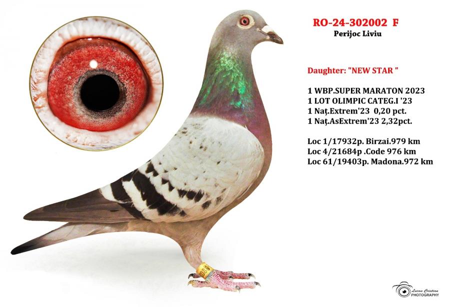 Incest: New Star Tata: New Star 1 WBP Super Maraton 2023 1 Lot Olimpic Categ. I 23 1 Nat. Extrem 23 0,20 pct 1 Nat. AS Extrem 23 2,32 pct Mama: De 303 – super reproducatoare Mama pentru: New Star 1 WBP Super Maraton 2023 1 Nat. Extrem 23 0,20 pct 1 Nat. AS Extrem 23 2,32 pct 1 Lot Olimpic Categ. I 23 Bunica pentru: Lloyd 074 2 Star Maraton Moldova 25 5 Nat. Extrem Tineret 25 Mama si bunica pentru: Loc 1/17932p 979 km 23 Loc 4/21684p 976 km 23 Loc 19/2047p 759 km pui 24 Loc 20/10784p 981 km 25 Loc 50/12971p 960 km 21 Loc 61/19403p 972 km 23 Loc 84/10701p 623 km 25 Loc 99/14092p 980 km 25