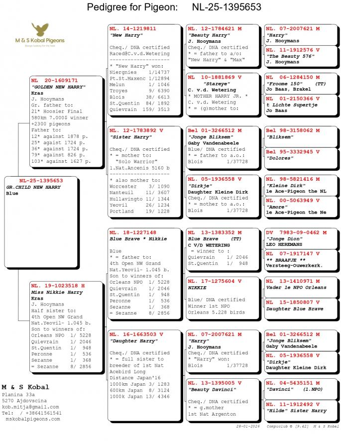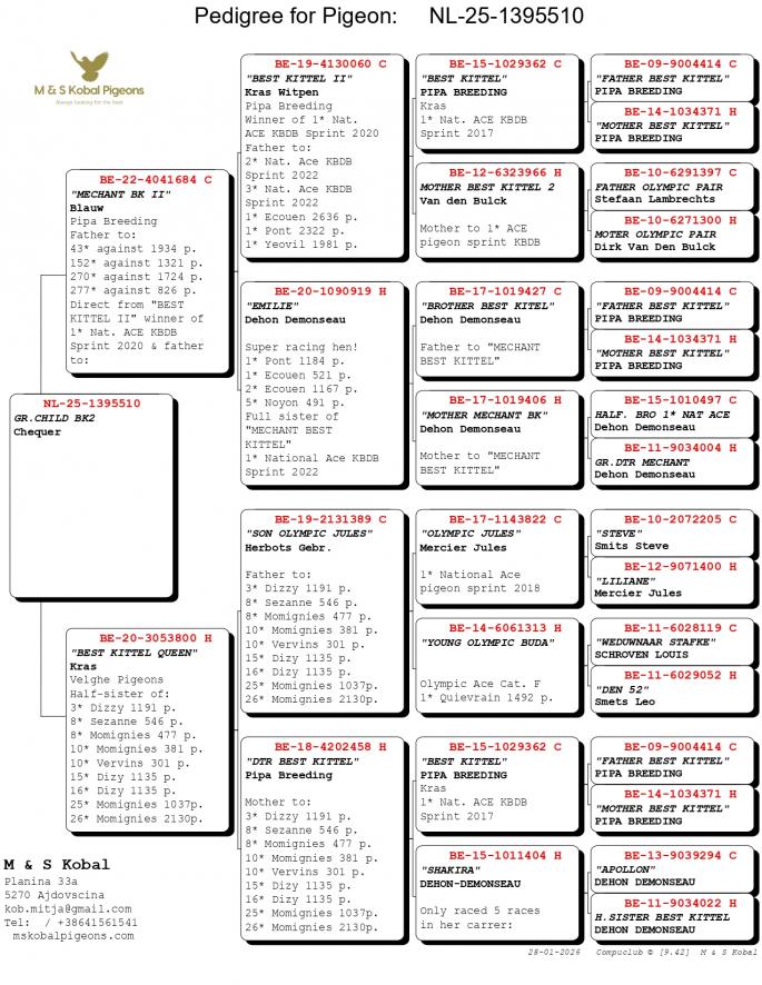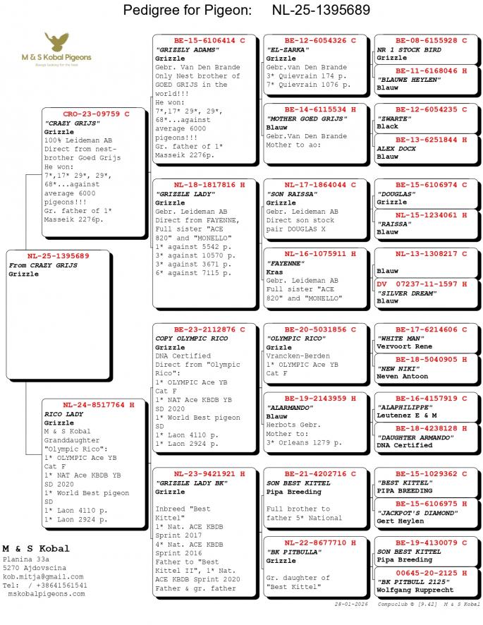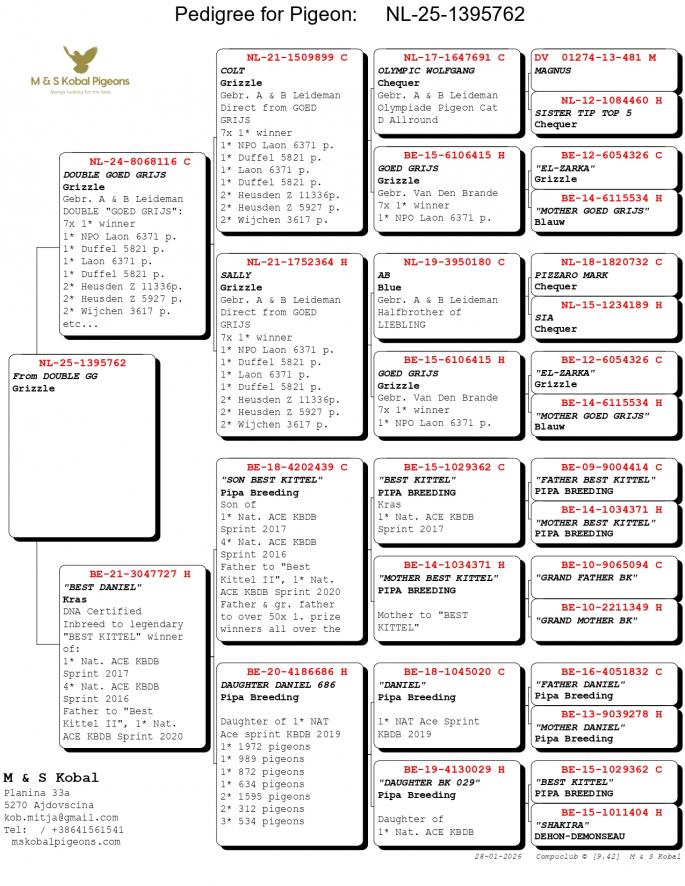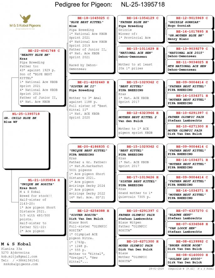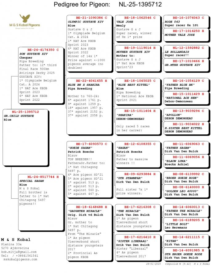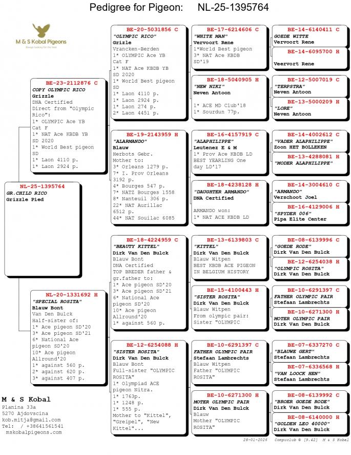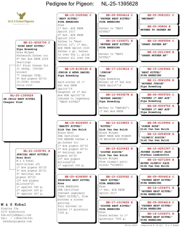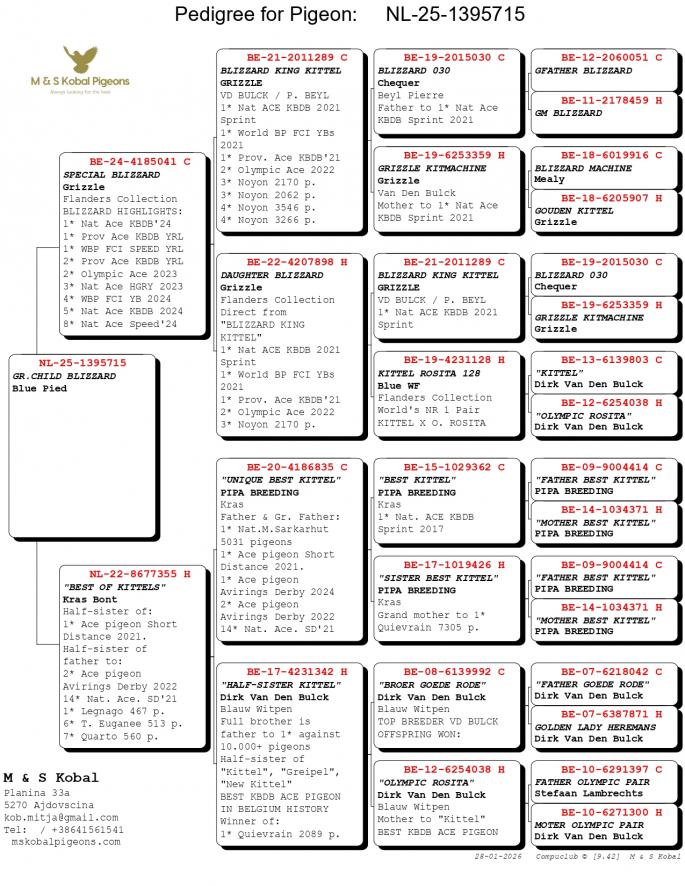 Nepot si Stanepot BLIZZARD KING KITTEL 1 Nat. Ace KBDB 2024 1 Prov. Ace KBDB YRL 1 WBP FCI Speed YRL 2 Prov. Ace KBDB YRL 2 Olympic Ace 2023 3 Nat. Ace HGRY 2023 4 WBP FCI YB 2024 5 Nat. Ace KBDB 2024 8 Nat. Ace Speed 2024 Mama semi-sora cu : 2 Ace pigeon Avirings Derby 2022 14 Nat. Ace SD 2021 1 Legnago 467 p. 6 T.Euganee 513 p. 7 Quarto 560 p. oferta curenta: RA-Pigeons |