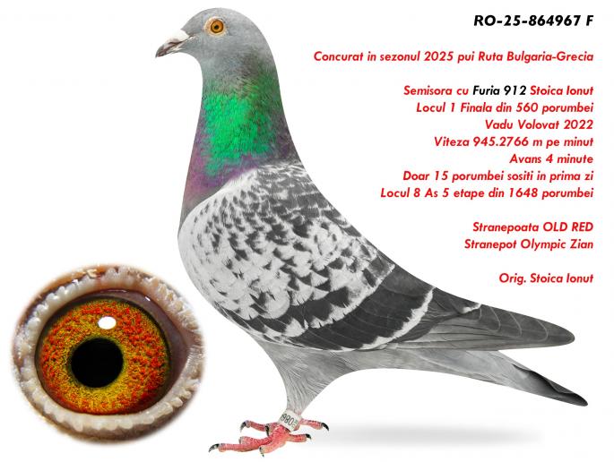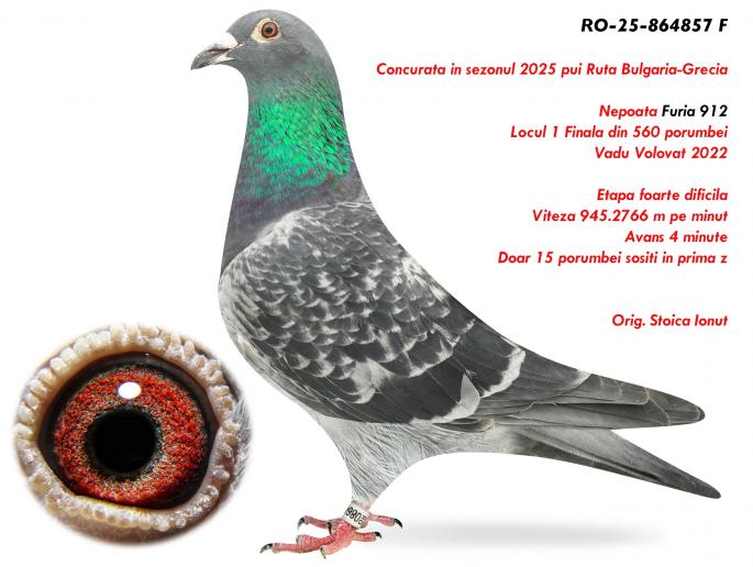 Semisora cu Furia 912 Locul 1 Finala din 560 porumbei Vadu Volovat 2022 Viteza 945.2766 m pe minut Avans 4 minute Doar 15 porumbei sositi in prima zi Locul 8 As 5 etape din 1648 porumbei