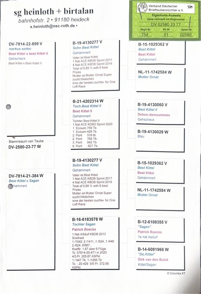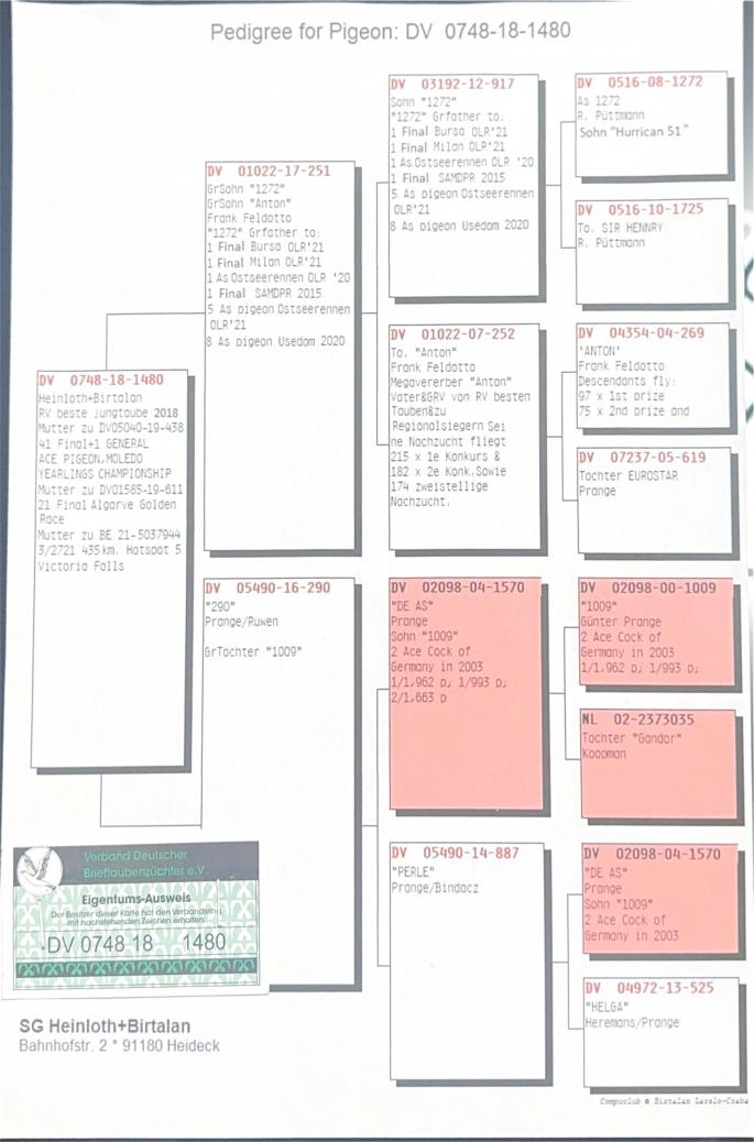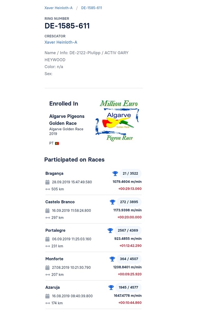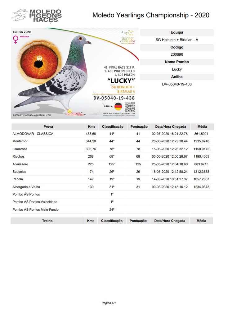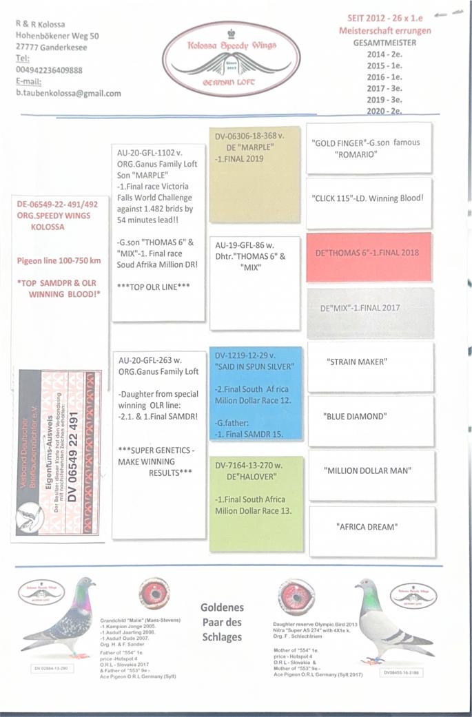 Mama la DV05040-19-438: 1 General Ace Pigeon Moledo Yarlings Championship 41 Final Mama la DV01585-19-611 21 Final Algarve Golden Race Mama la BE 21-5037944 3/2721 P 435km HS5 Victoria Falls Stranepoata DE 1009: 2 Ace Cock Germania 2003 1/ 1962 p. 1/ 993 p. 2 / 1663 p. oferta curenta: - |