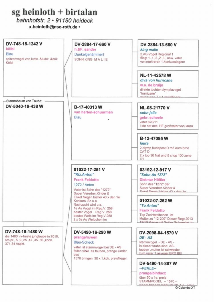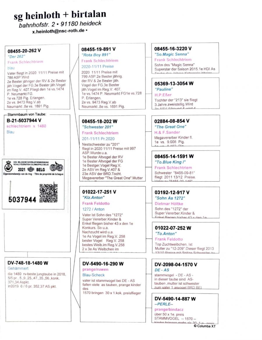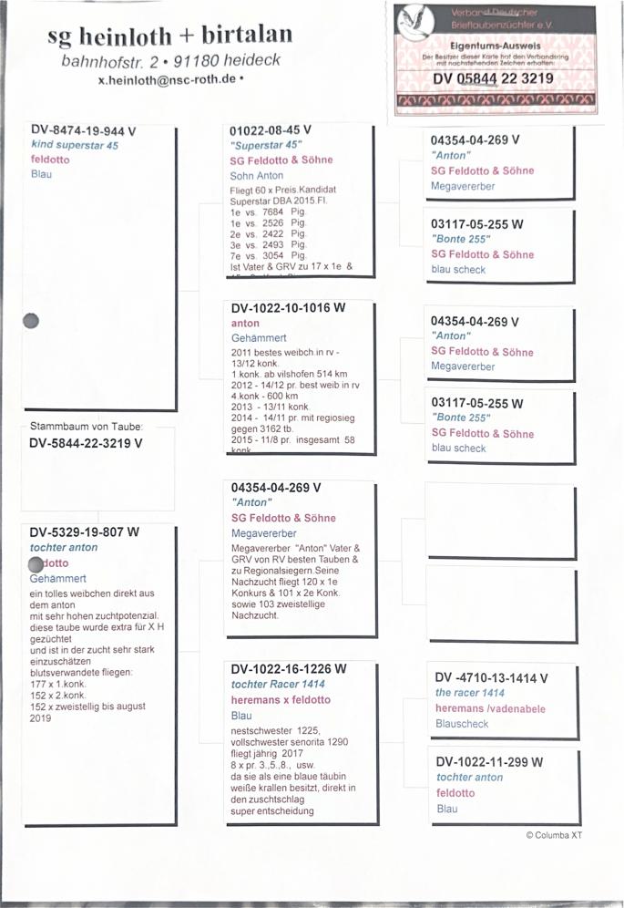 Nepot si stranepot Anton reproducător de elita: Anton este tata È™i bunic (GRV) al celor mai buni porumbei din asociaÈ›ie È™i din concursuri regionale. DescendenÈ›ii sai au obÈ›inut: 120 × locul 1 10 × locul 1 în concurs È™i 103 clasări cu două cifre