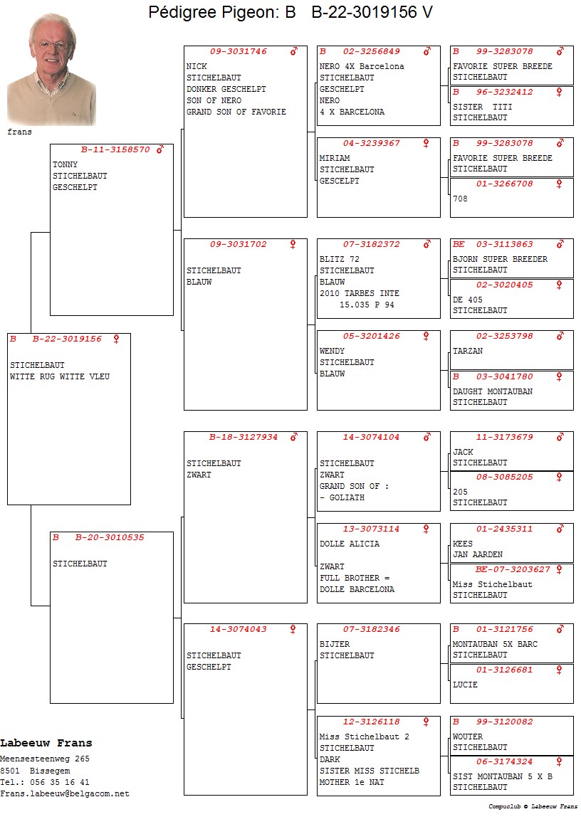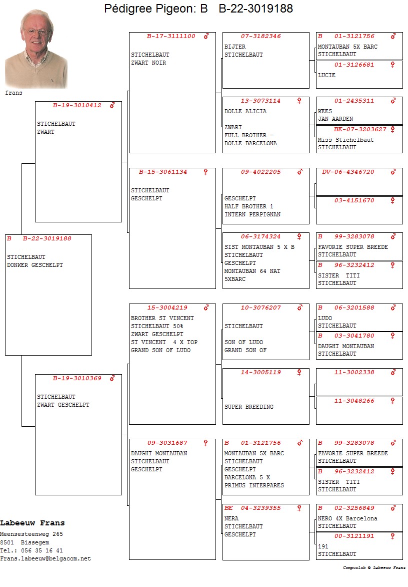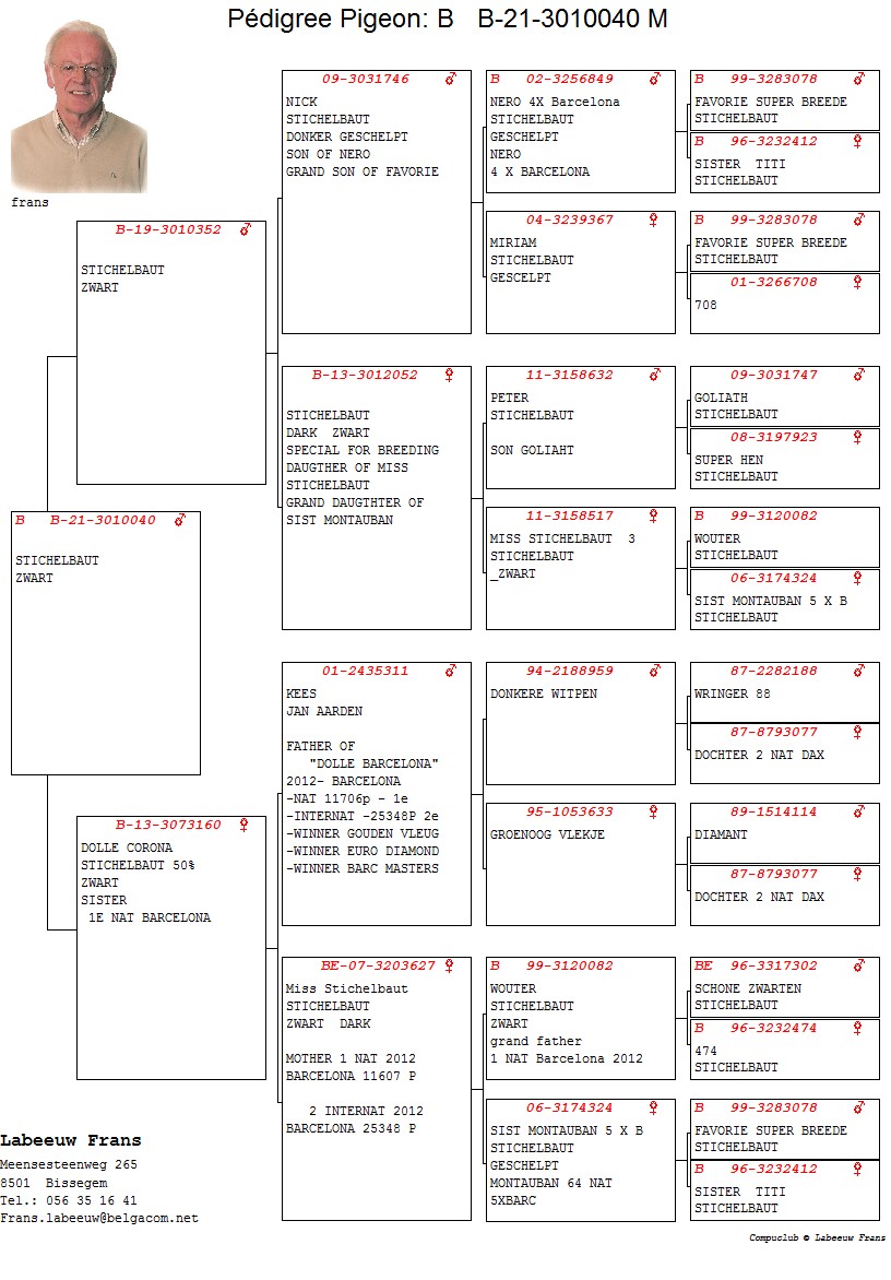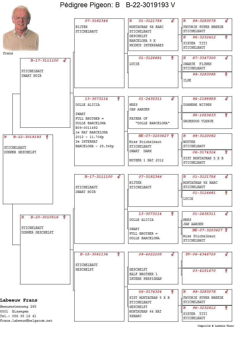 100% Stichelbaut via Frans Labeeuw Linie Mountanban, Dole Alicia,Bijter ... Bunica din partea tatalui este sora cu: Dole Barcelona 1 Nat Barcelona 11706 p. 2 Int Barcelona 25438 p. oferta curenta: - |