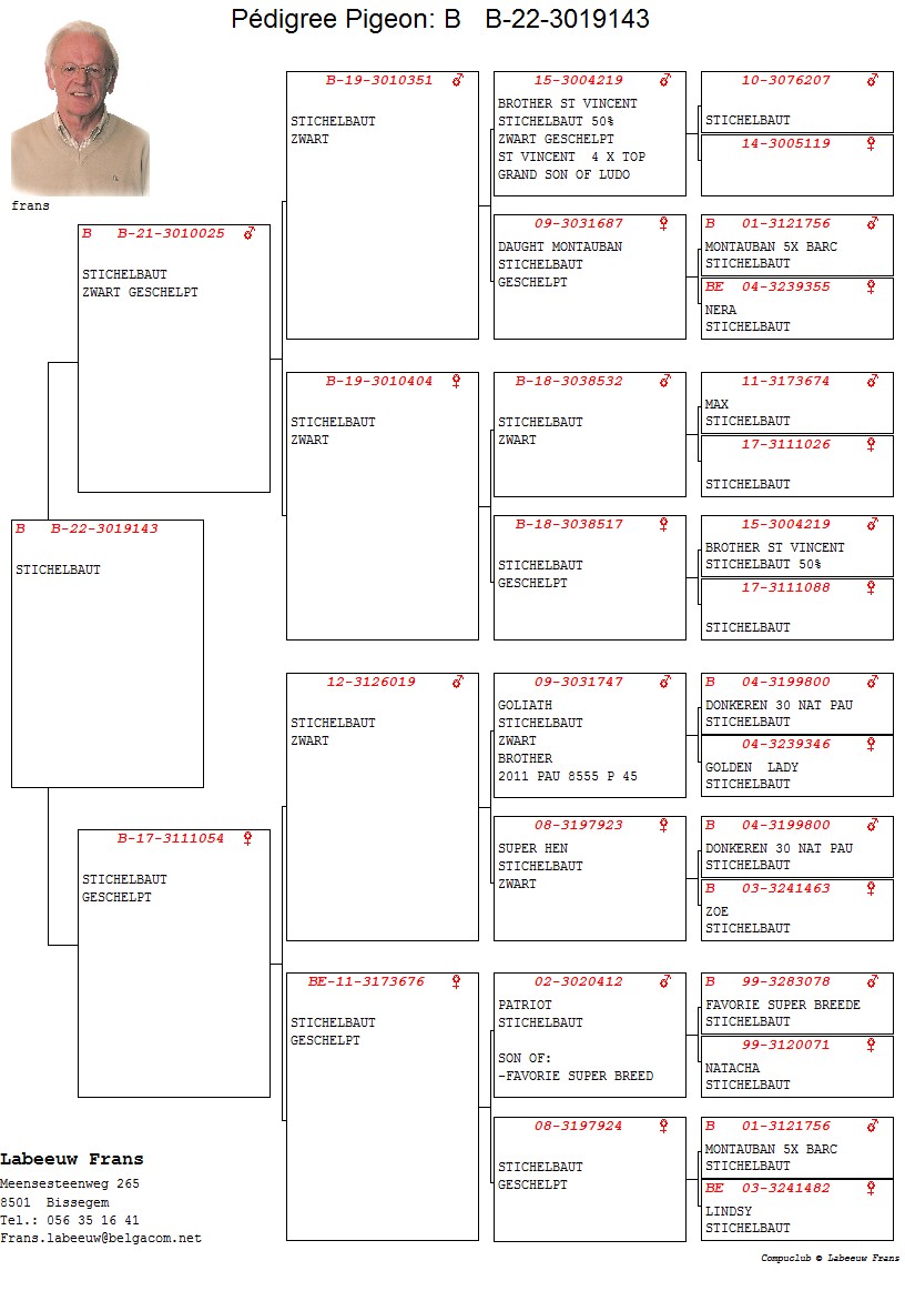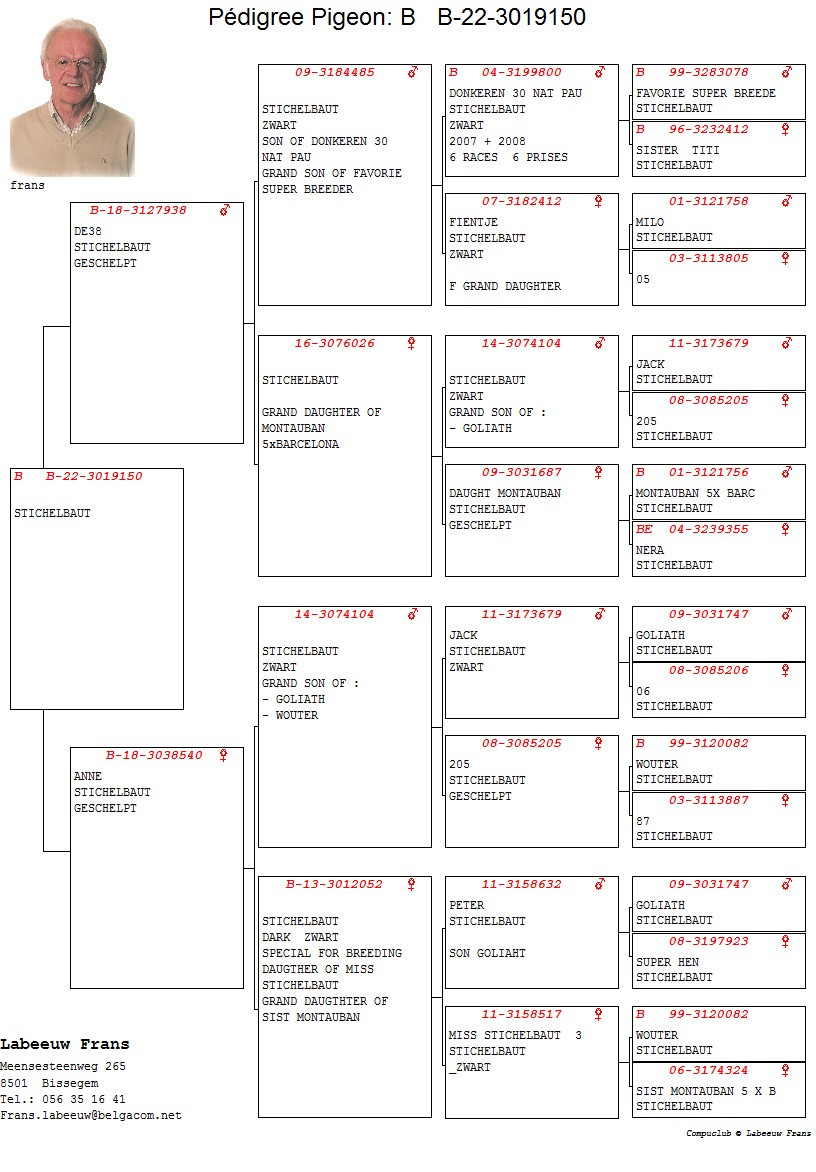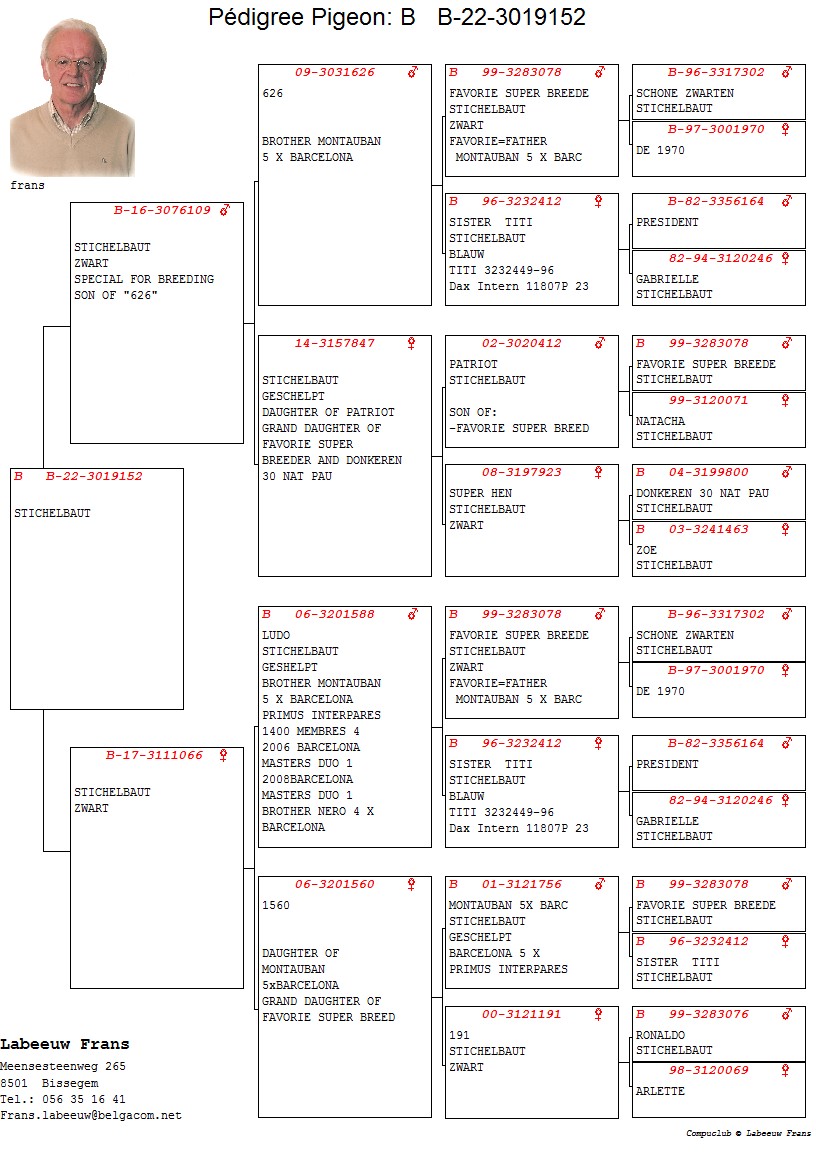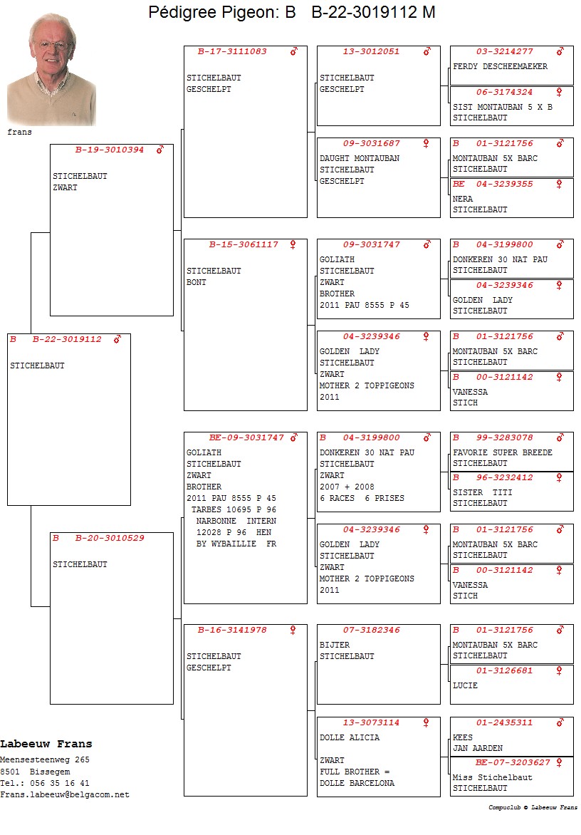 100% Stichelbaut via Frans Labeeuw Linie Mountanban, Dole Alicia,Bijter ... Bunica din partea tatalui este sora cu: Dole Barcelona 1 Nat Barcelona 11706 p. 2 Int Barcelona 25438 p. oferta curenta: - |