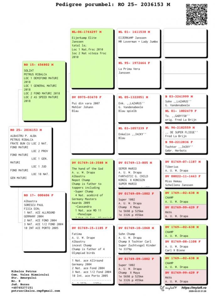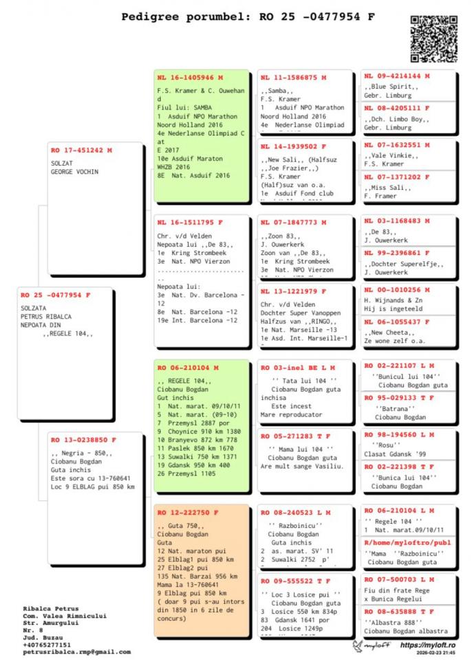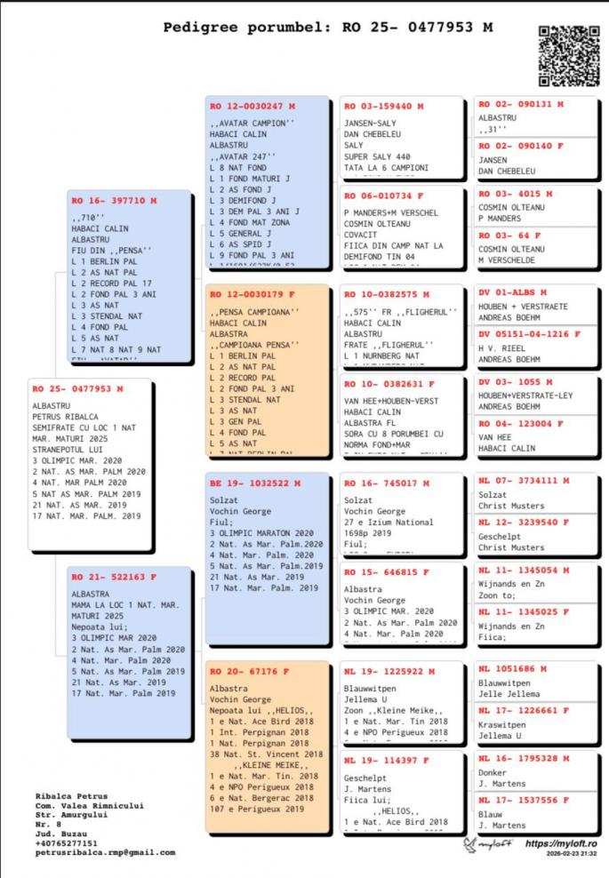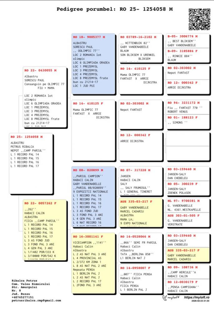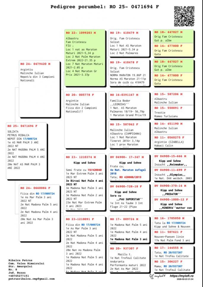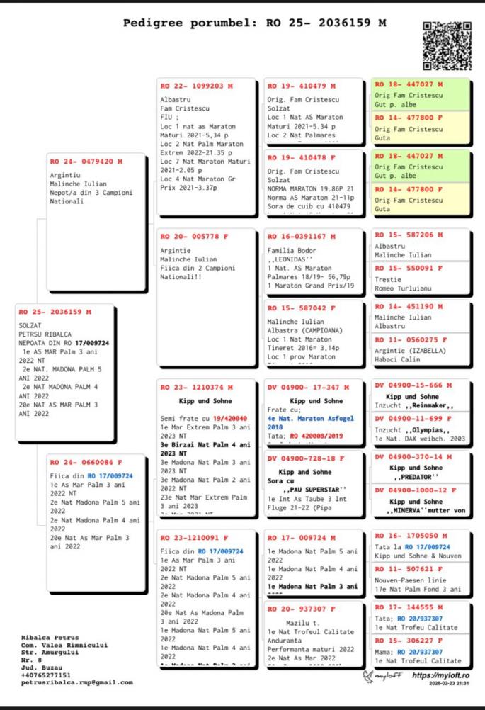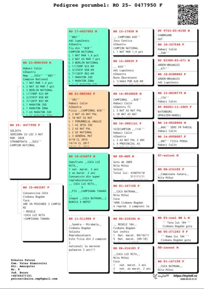 Semisora cu: Loc 3 Nat Maraton 2020 Stranepoata Jucu: Loc 1 Nat Maraton 1.4 pct. Loc 2 Nat As Maraton 7 pct. Stranepoata Campionul 028: Loc 3 Nat As nat. Pal. Loc 10 Nat AS Nat. Loc 1 Porumbelul Anului Mama are in pedigree 3 campioni: Regele Cuca lui Nita Campioana Tanara oferta curenta: - |