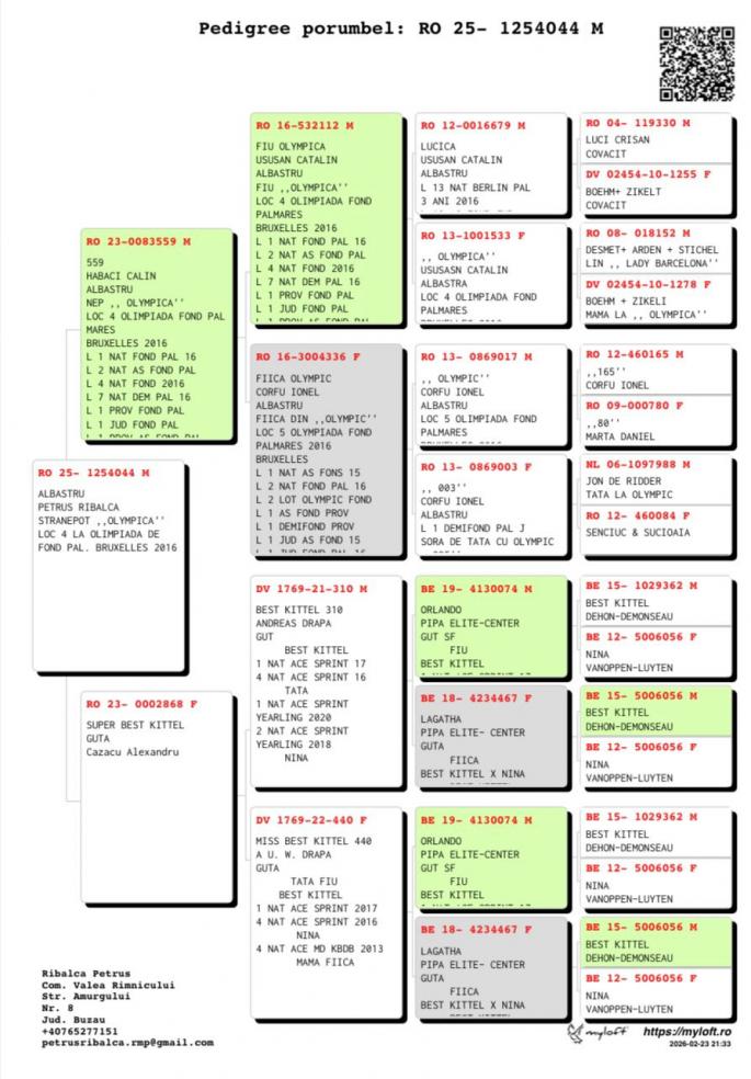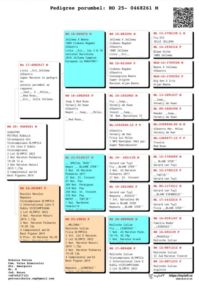 Stranepota: Vicecampioana Olympica 2 Int Cat. E Dublu VIcecampioana 2 Lot Olimpic 2022 2 Nat Maraton Maturi 2019 1.72 pct. 2 nat Maraton Palmares 19-20 12 pct. 4 World Best Pigeon 2019 Stranepota Blauwe Ster 2 Nat As Mataton Palmares 2017 Stranepoata Toetje 1 Nat Narbone Femele oferta curenta: - |