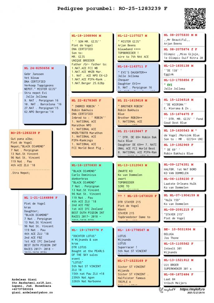 Mama este fiica BLACK DIAMOND - Carlo Dominicus 7 Nat. Perpignan 13 Nat. St. Vicent 96 Nat. St. Vicent 119 Nat. Pau 4th ZLU `18 2nd ACE FBZ 1St Ace IFC Zeeland Best Duth Pigeon INT Races 2017-2018