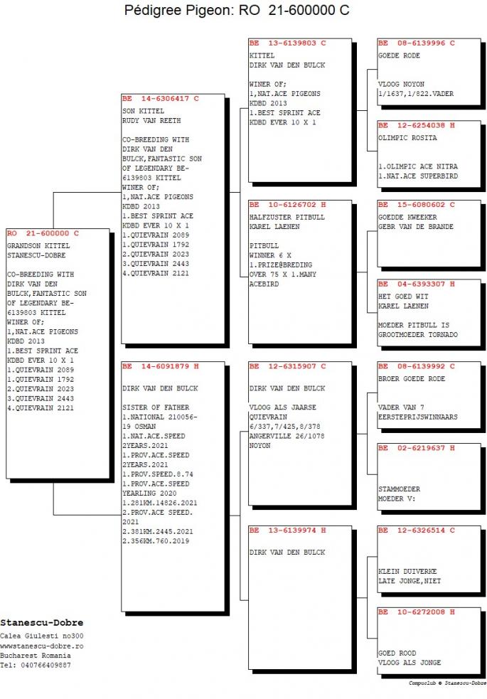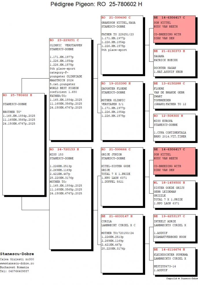 Fiica Olimpic Verstappen 1 - 171 km – 1.977 p 1 - 226 km – 1.854 p 1 - 226 km – 1.575 p Locul 8 Ace Sport Categoria F Olimpiada Tineret Maastricht 2024 Locul 5 categorie tineret – World Best Pigeon (coeficient 1.60)