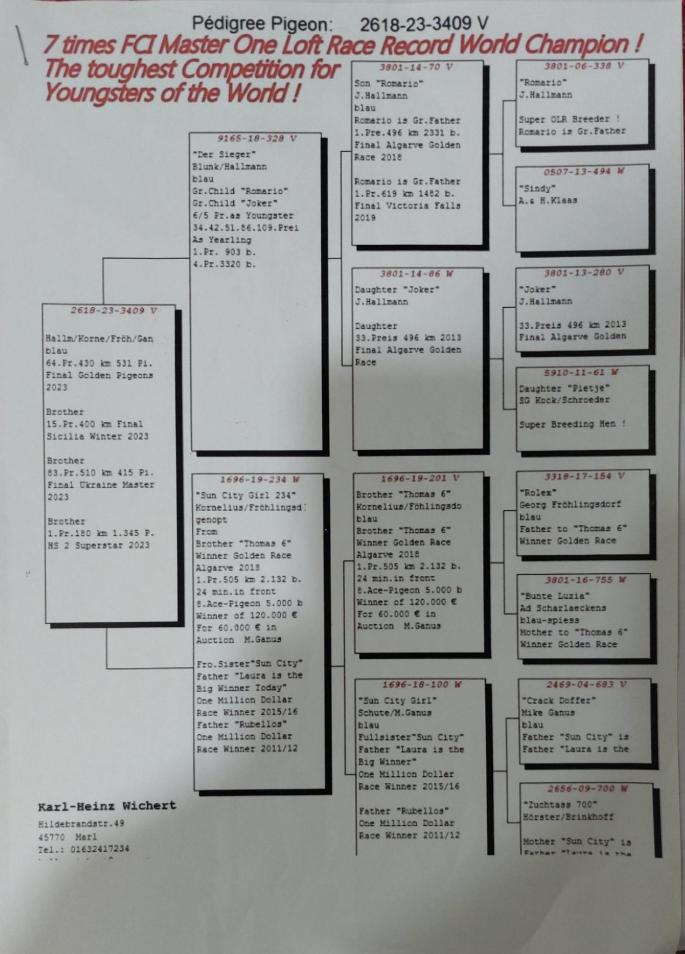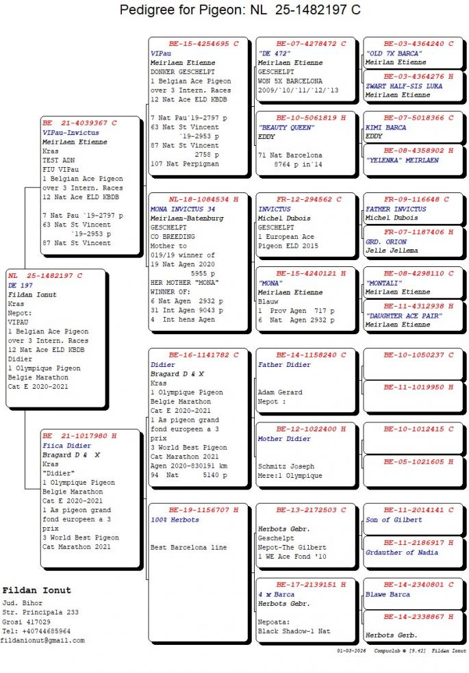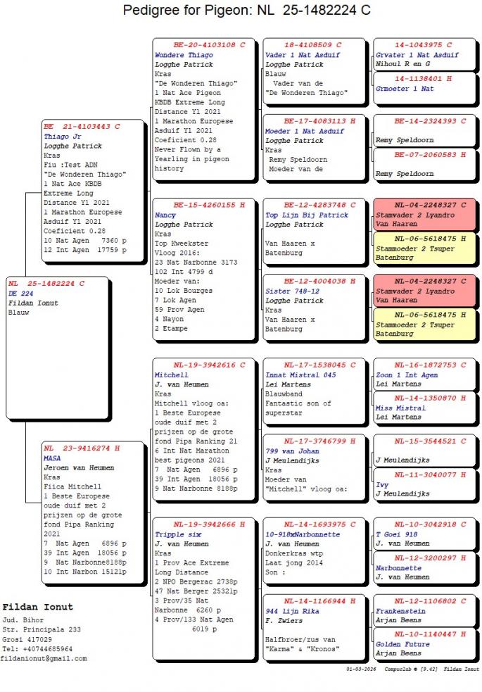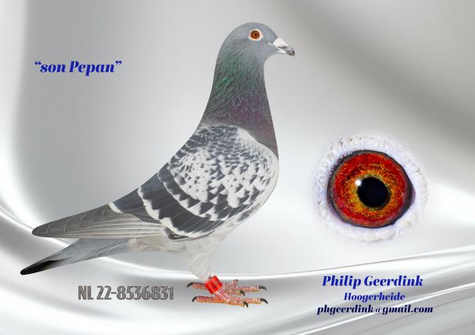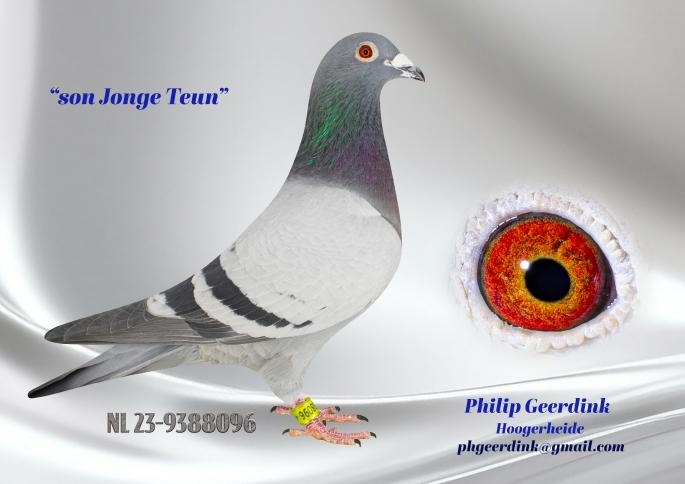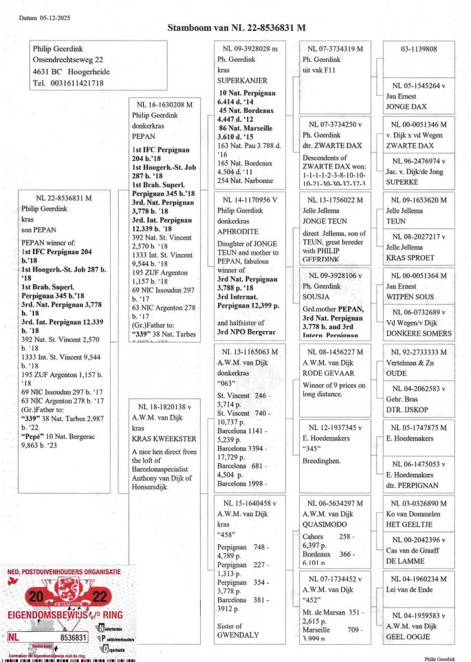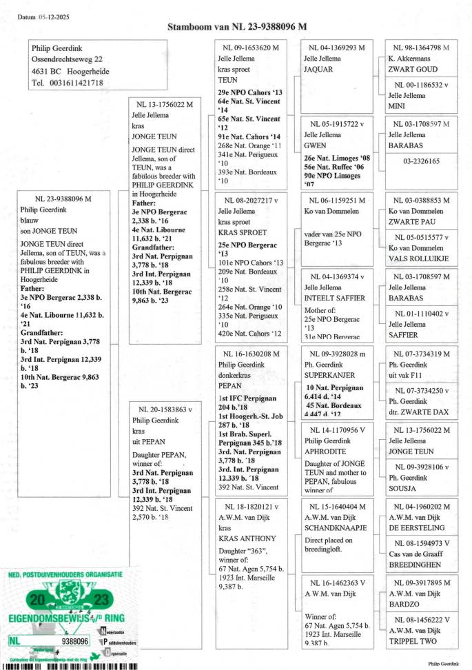 Fiu JONGE TEUN super reproducator JONGE TEUN este tata si bunic la: Loc 3 NPO Bergerac 2338p 2016 Loc 3 Nat Perpignan 3778P 2018 Loc 3 Int Perpignan 12339P 2018 Loc 4 Nat Libourne 11632p 2021 Loc 10 National Bergerac 2023 Nepot PEPAN, super reproducator: Loc 3 National Perpignan 3778 porumbei 2018 Loc 3 International Perpignan 12339 porumbei 2018