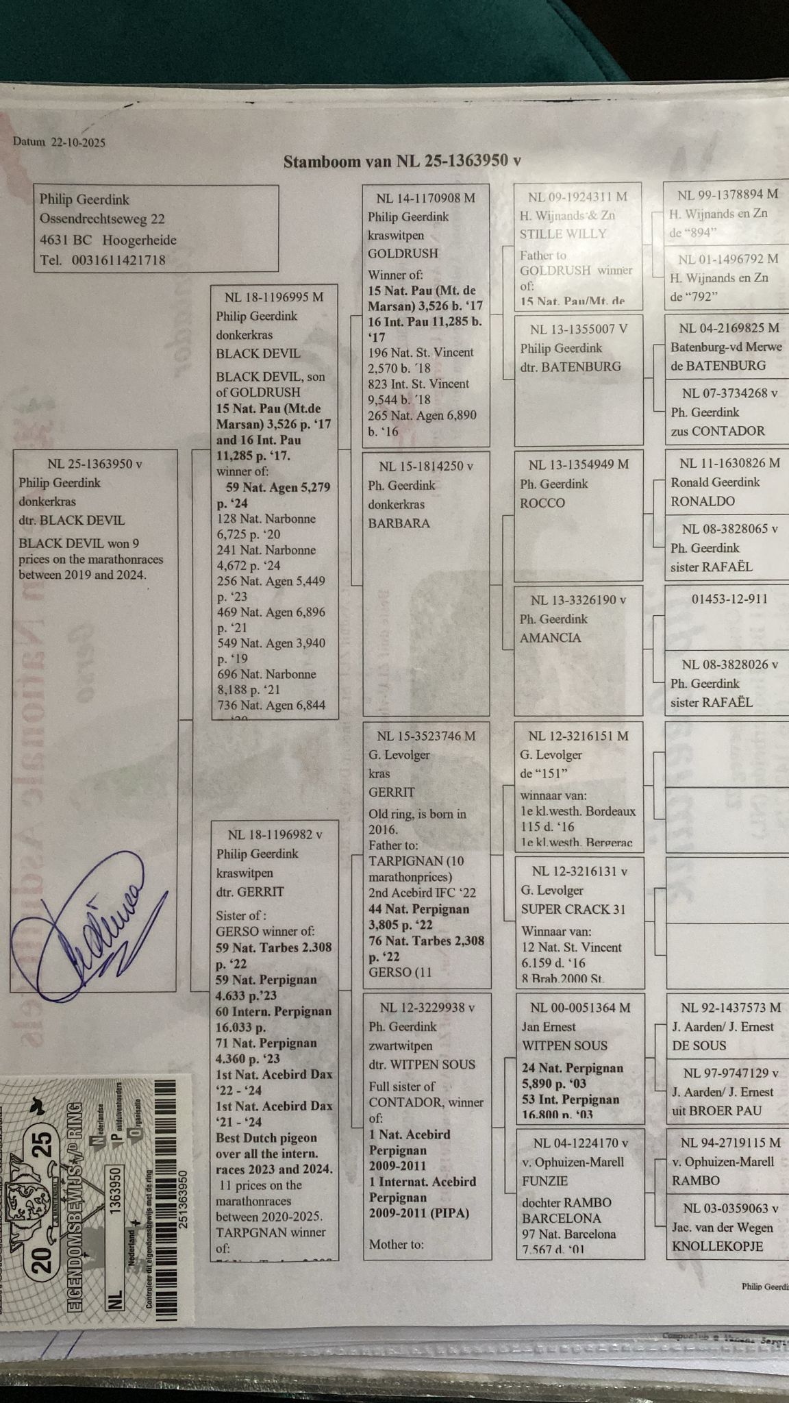 Fiu Sky Verweij-de Haan 1 Acepigeon North South Holland 19 1 Acepigeon Fondunion 2000 19 3 Nat. Acepigeon ZLU 19 2 Nat. Acepigeon WHZB/BOTB 19 188 Nat St Vince 19 12.692b 156 Nat Perpignan 20 2.354b Toate cursele peste 1.050 km! Nepot Red Messi nevandut |